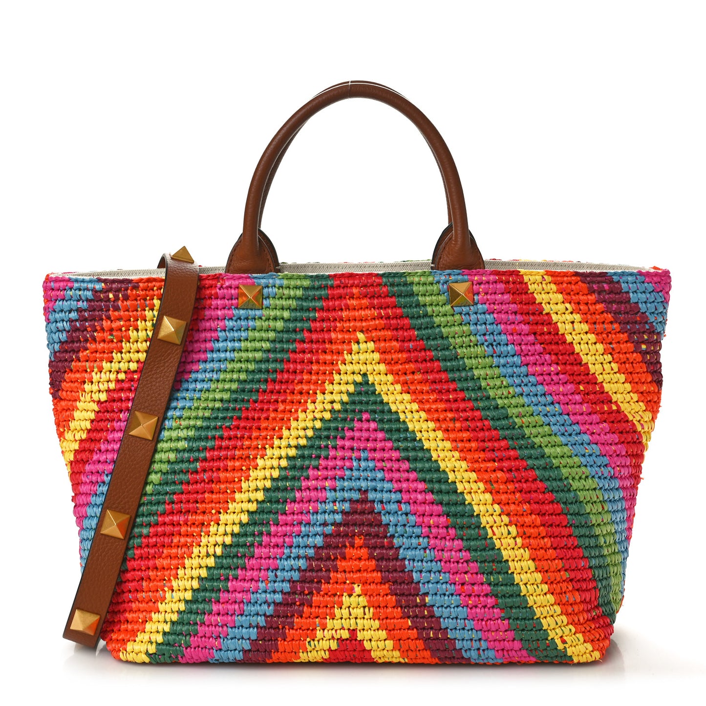 Raffia Calfskin Rockstud Summer Tote Multicolor