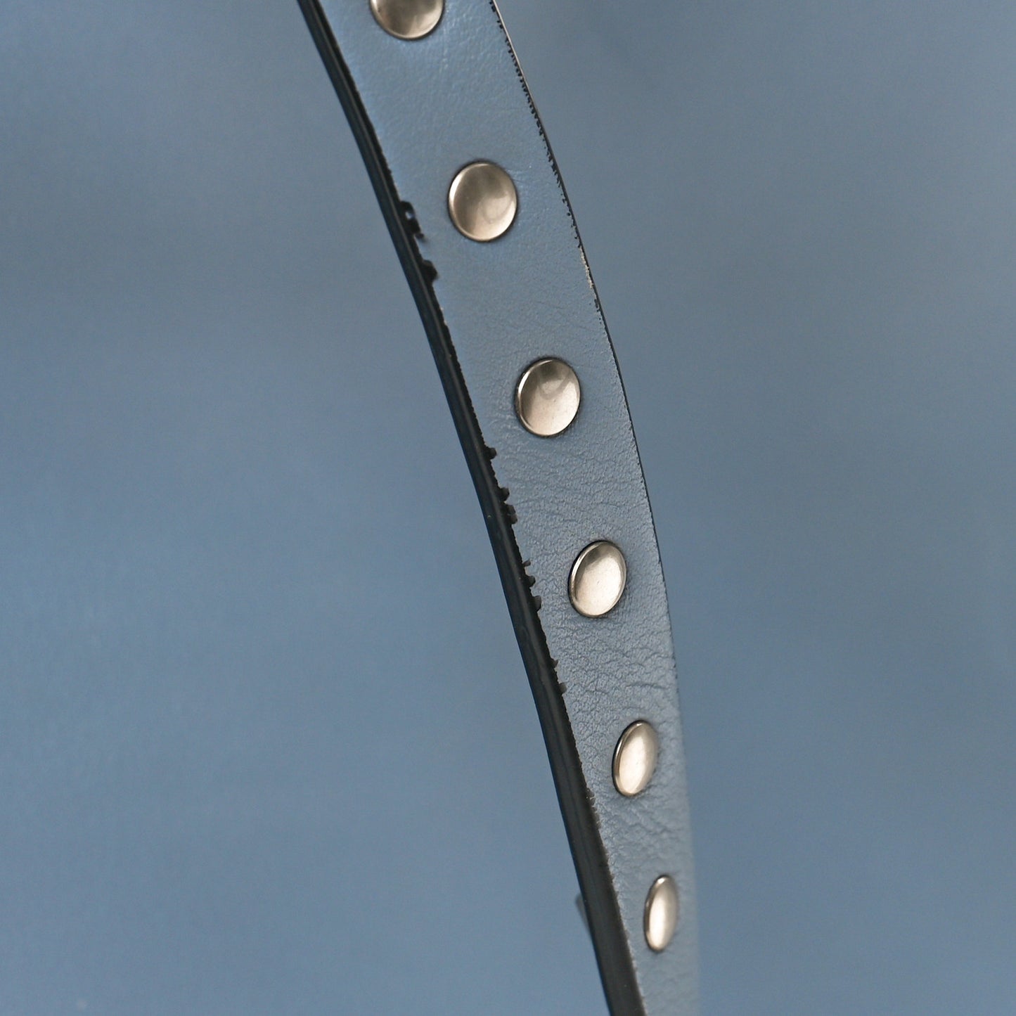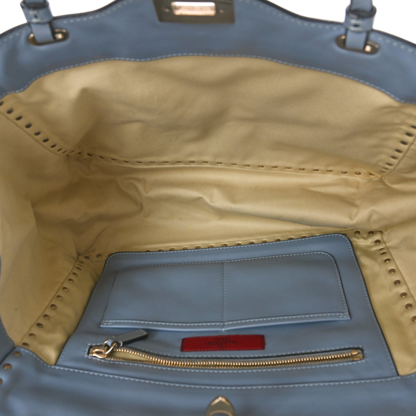 This is an authentic VALENTINO GARAVANI Vitello Medium Rockstud Tote in London Stone. This edgy tote is crafted of rich calfskin in blue with signature light gold pyramid stud borders around the bag and on the handles. The bag features a removable shoulder strap and a gold switch lock on the front. This opens to a beige fabric interior with hanging zipper and patch pockets.