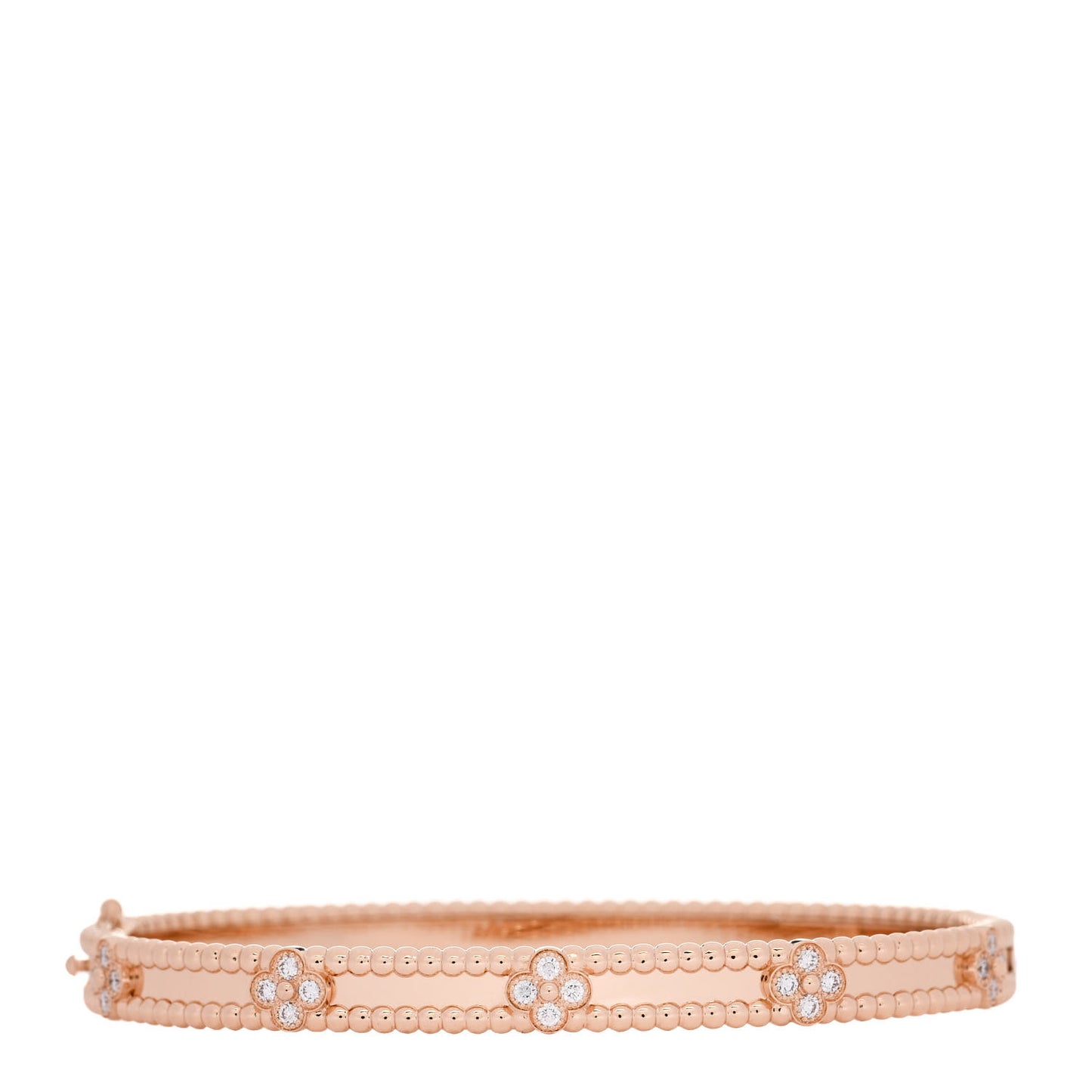 This is an authentic VAN CLEEF & ARPELS 18K Rose Gold Diamond Perlee Sweet Clovers Bracelet size L. The bracelet is crafted of 18 karat rose gold and features a hinged band set with diamond clover motifs, approximately .68 total carat weight.Follow this item for alerts. Van Cleef & Arpels is a registered trademark of Van Cleef & Arpels. FASHIONPHILE is not affiliated with Van Cleef & Arpels.
