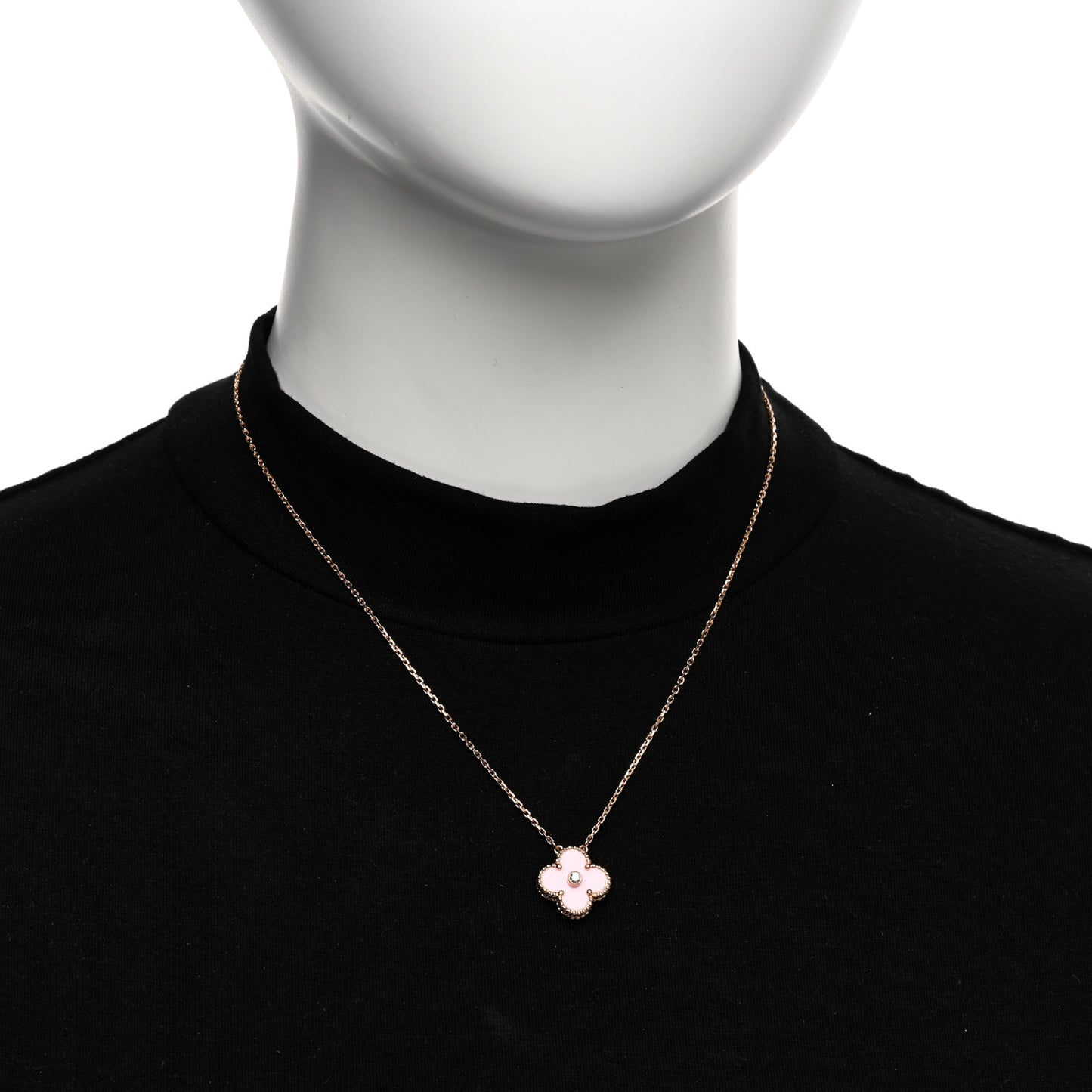 This is an authentic VAN CLEEF & ARPELS 18K Rose Gold Diamond Pink Porcelain Vintage Alhambra Pendant Necklace. The necklace is crafted of 18 karat rose gold and features the signature Alhambra clover motif set with pink porcelain and a single round brilliant cut diamond, approximately .05 carat.Follow this item for alerts. Van Cleef & Arpels is a registered trademark of Van Cleef & Arpels. FASHIONPHILE is not affiliated with Van Cleef & Arpels.