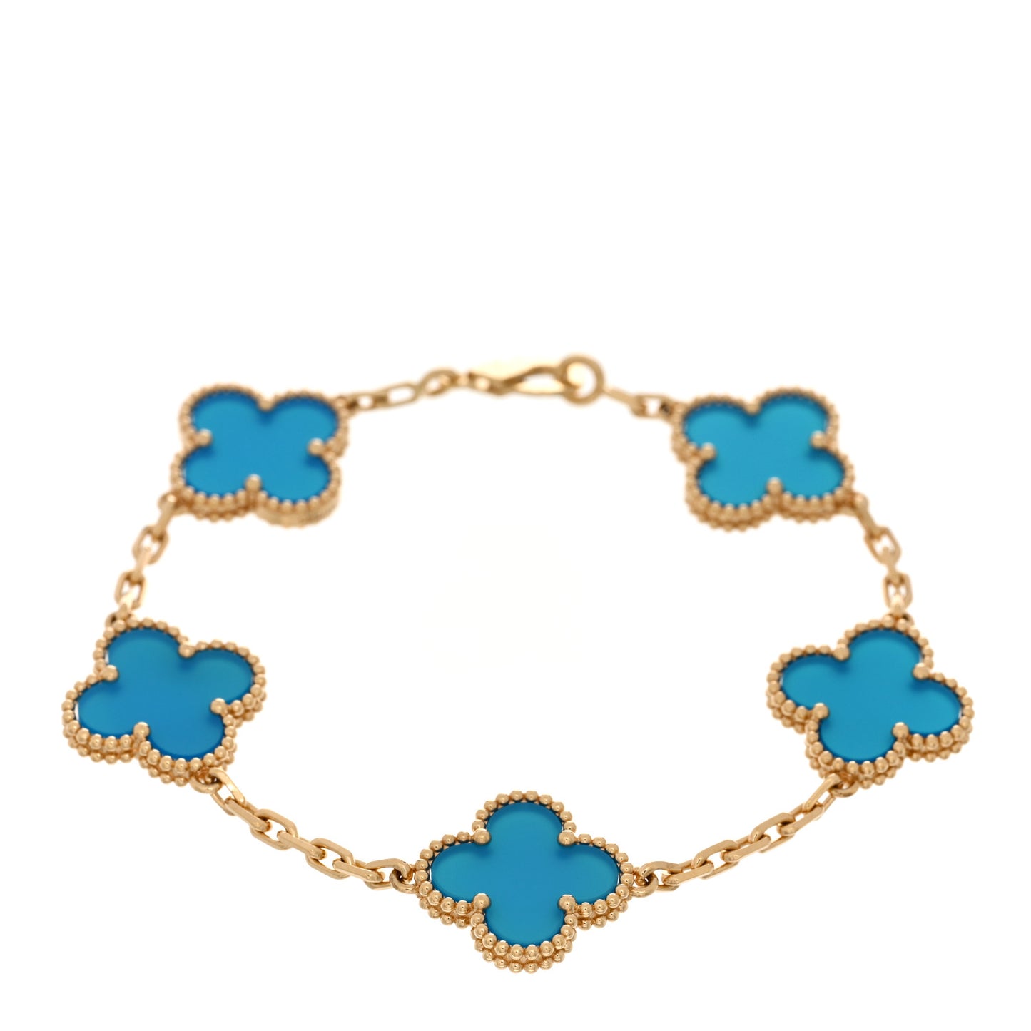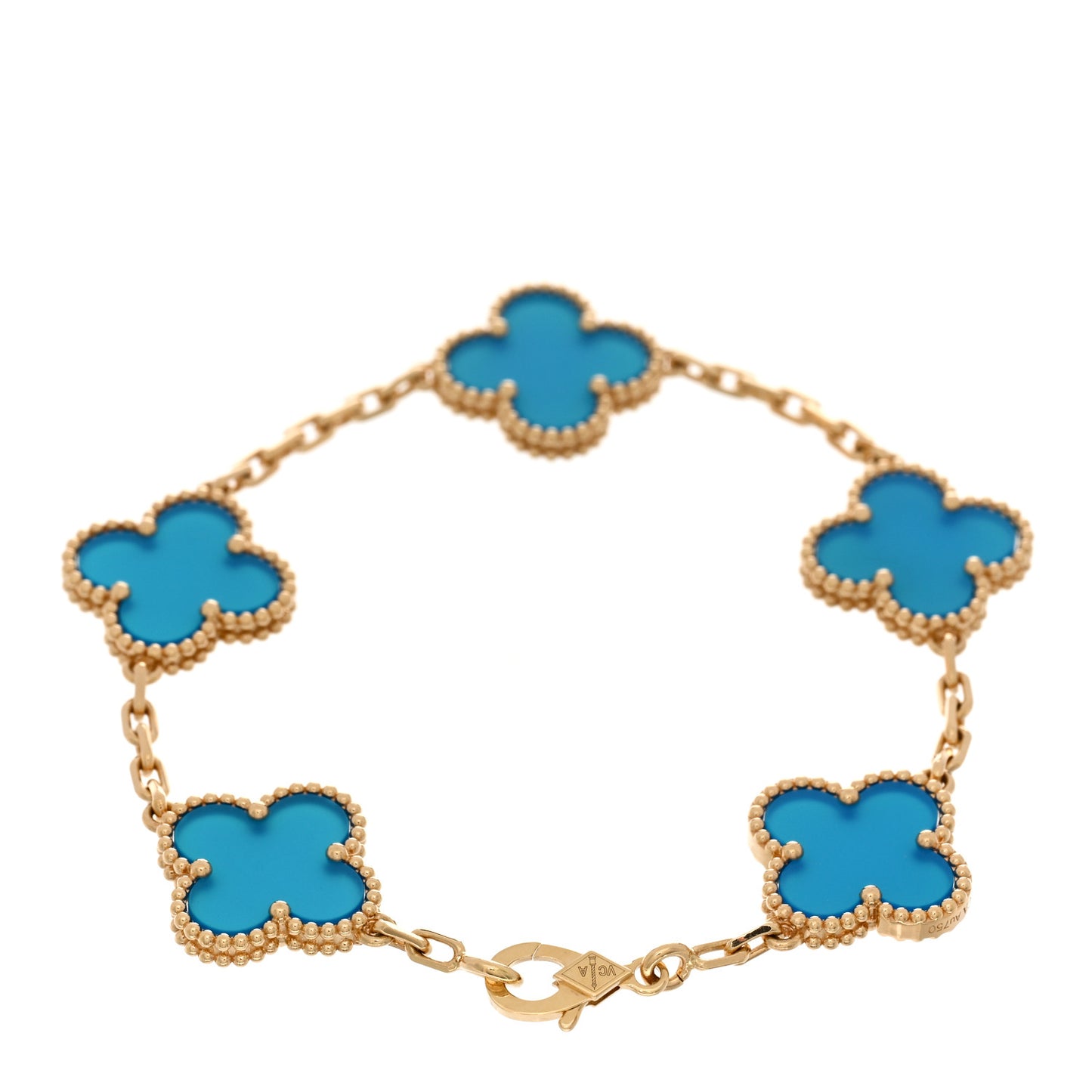 This is an authentic VAN CLEEF & ARPELS 18K Yellow Gold Blue Agate 5 Motifs Vintage Alhambra Bracelet. The bracelet is crafted of 18 karat yellow gold and features five Alhambra clover motifs set with polished blue agate.Follow this item for alerts. Van Cleef & Arpels is a registered trademark of Van Cleef & Arpels. FASHIONPHILE is not affiliated with Van Cleef & Arpels.