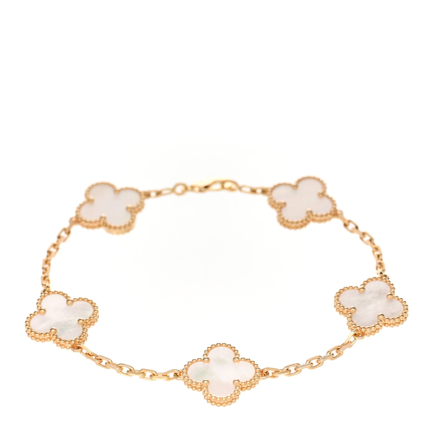 This is an authentic VAN CLEEF & ARPELS 18K Yellow Gold Mother of Pearl 5 Motifs Vintage Alhambra Bracelet. The bracelet is crafted of 18 karat yellow gold and features five clover motifs set with mother-of-pearl stones.Follow this item for alerts. Van Cleef & Arpels is a registered trademark of Van Cleef & Arpels. FASHIONPHILE is not affiliated with Van Cleef & Arpels.