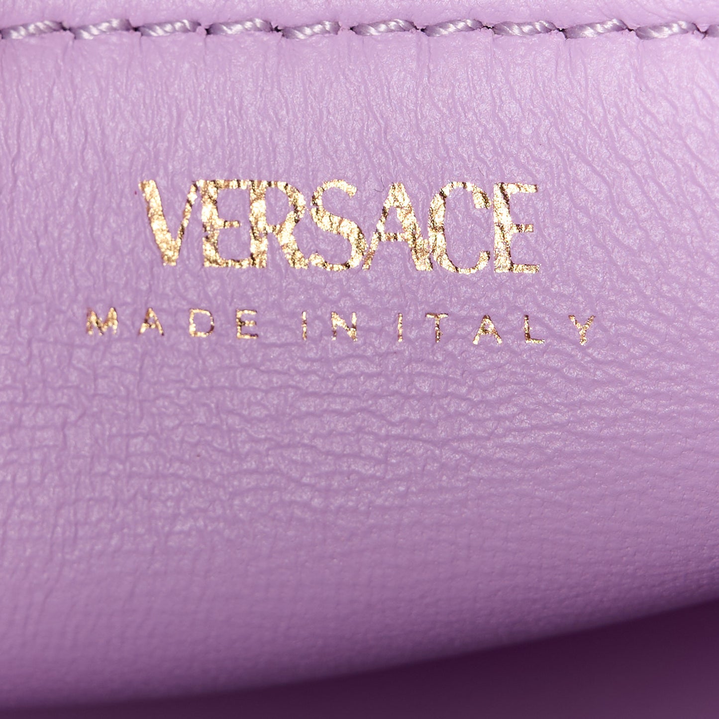 This is an authentic VERSACE Calfskin Medium La Medusa Top Handle Handbag in Red. This luxurious bag is crafted of grained calfskin leather in bright Red. The bag features a top handle, chain strap, leather shoulder strap and a front-facing Medusa blackhead plaque in red. The broad open top opens to a contrasting purple interior with a pocket.Follow this item for alerts. Versace is a registered trademark of Versace. FASHIONPHILE is not affiliated with Versace.