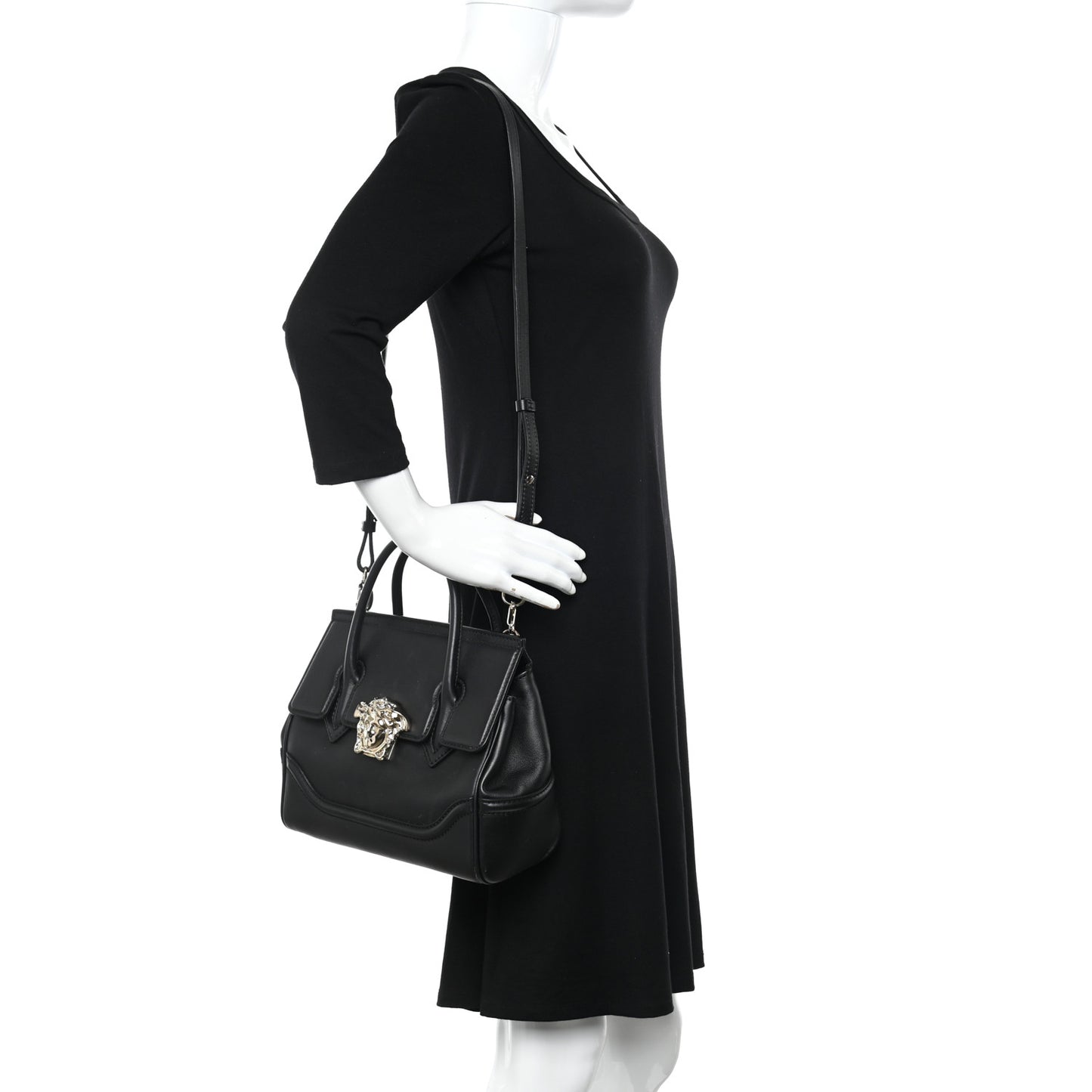 This is an authentic VERSACE Calfskin Medium Palazzo Empire Bag in Black. This luxurious bag is crafted of calfskin leather in Black. The bag features rolled leather handles, an optional leather shoulder strap, and an iconic medusa lock. The flap opens to a fabric interior with zipper and patch pockets.Follow this item for alerts. Versace is a registered trademark of Versace. FASHIONPHILE is not affiliated with Versace.