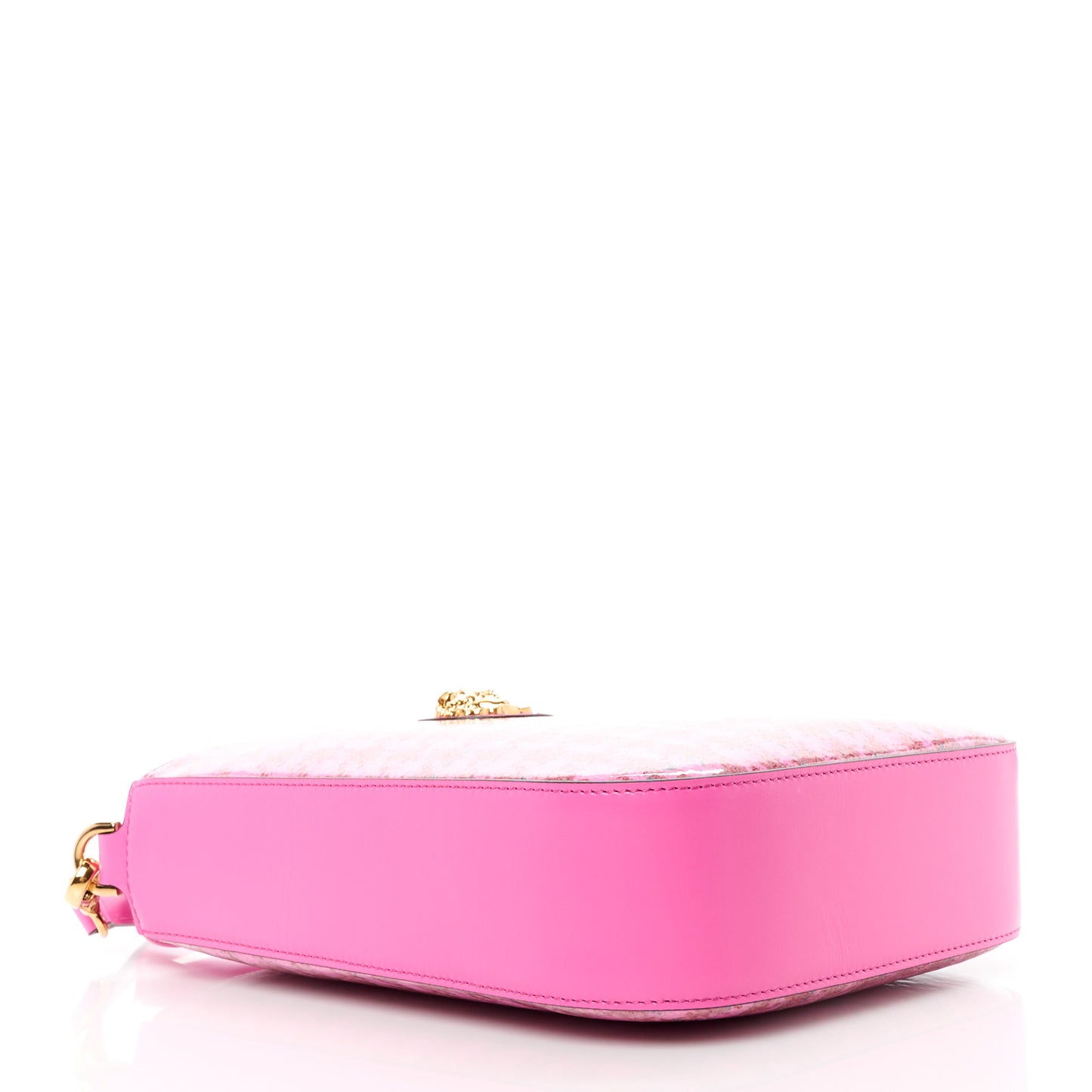 This is an authentic VERSACE Calfskin Vinyl Mini Houndstooth La Medusa Tote Bag in Pink and Multicolor. This handbag is crafted of grained leather in dark pink and vinyl covered houndstooth fabric. This bag features a front facing gold medusa figure, crossbody shoulder strap and polished gold hardware. The top zipper opens to a black fabric interior.Follow this item for alerts. Versace is a registered trademark of Versace. FASHIONPHILE is not affiliated with Versace.