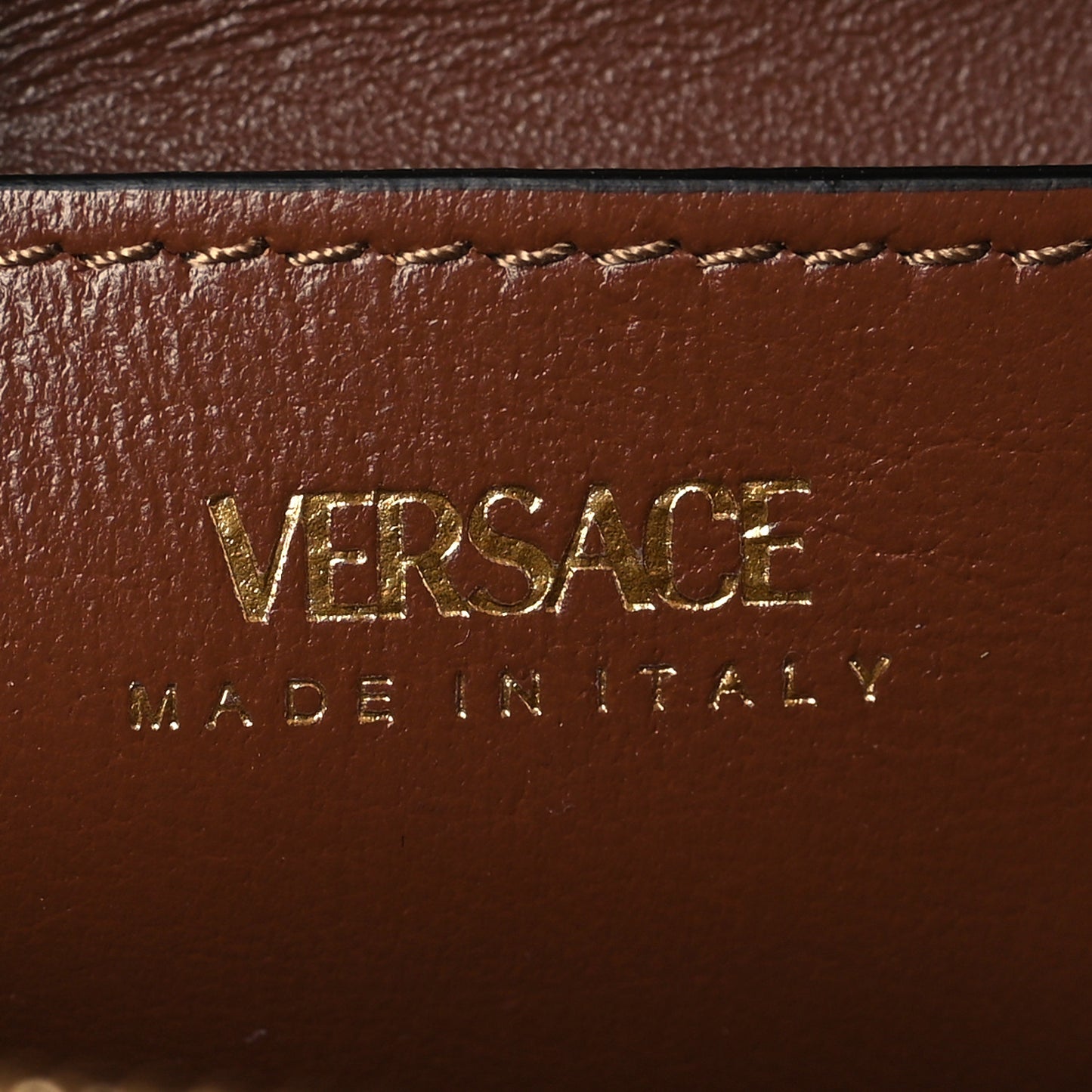 This is an authentic VERSACE Denim Mini La Medusa Chain Round Crossbody Bag in Navy Blue. This handbag is crafted of fabrics in blue. This bag features leather top handles, a front facing gold medusa figure, and polished gold hardware. The top zipper opens to a brown leather interior.Follow this item for alerts. Versace is a registered trademark of Versace. FASHIONPHILE is not affiliated with Versace.