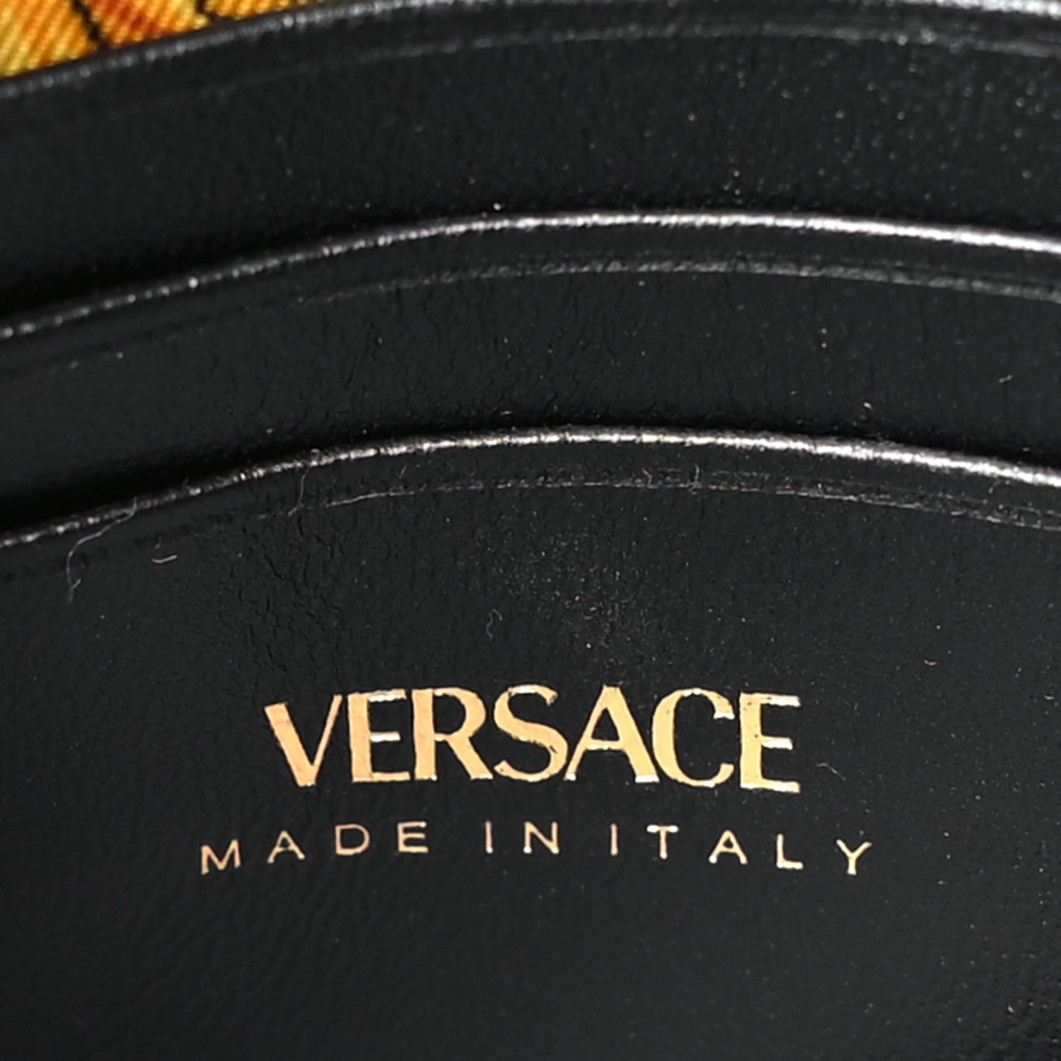 This is an authentic VERSACE Nappa Quilted Virtus Evening Bag in Black. This chic shoulder bag is crafted of quilted nappa leather in black. The bag features an optional silver chain shoulder strap, and a front-facing snap closure with a polished gold V. The flap opens to a matching black interior with card slots.Follow this item for alerts. Versace is a registered trademark of Versace. FASHIONPHILE is not affiliated with Versace.