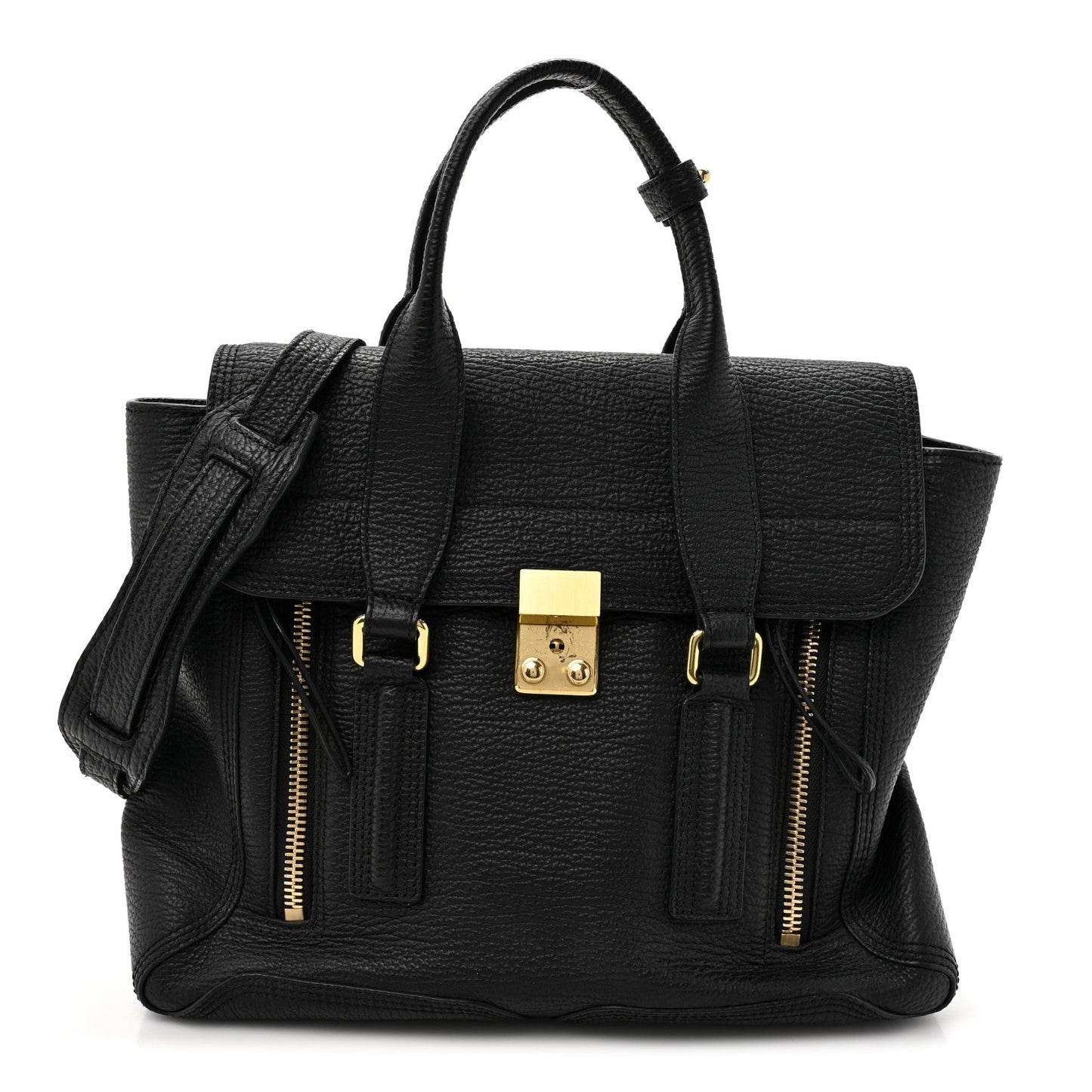 This is an authentic 3.1 PHILLIP LIM Textured Calfskin Medium Pashli Satchel in Black. This handbag is crafted of textured calfskin leather in black. It features rolled leather top handles, an optional, adjustable crossbody strap, vertical zipper detailing that expands the capacity of the bag, and a crossover flap with a gold-toned press lock. This opens to a black fabric interior with a zipper pocket.Follow this item for alerts. 3.1 Phillip Lim is a registered trademark of 3.1 Phillip Lim. FASHIONPHILE is not affiliated with 3.1 Phillip Lim.