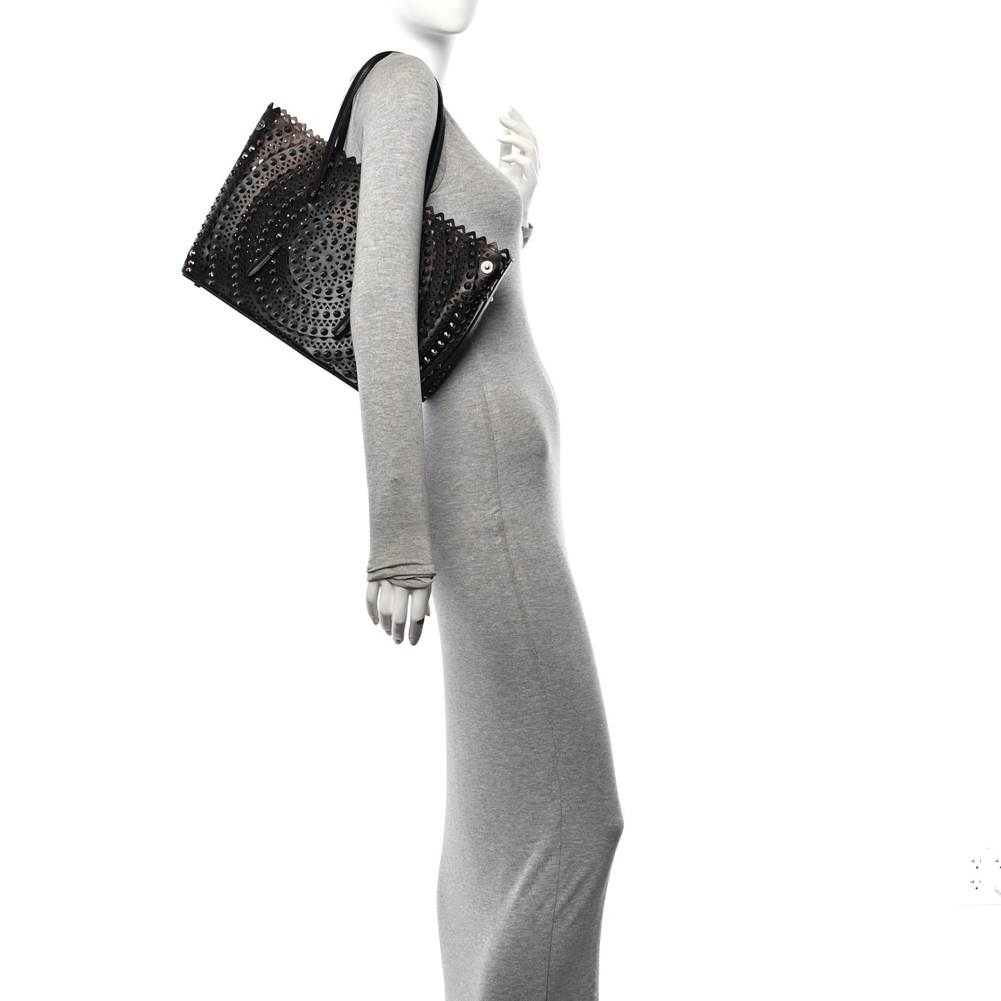 This is an authentic ALAIA Calfskin Laser Cut Studded Mina 32 Tote in Black. This stylish tote is crafted of black calfskin leather with a laser-cut design and silver studs throughout. The bag features narrow leather top handles and a broad and easy access open top that reveals a beige leather interior with a mirror.Follow this item for alerts. Alaia is a registered trademark of Alaia. FASHIONPHILE is not affiliated with Alaia.