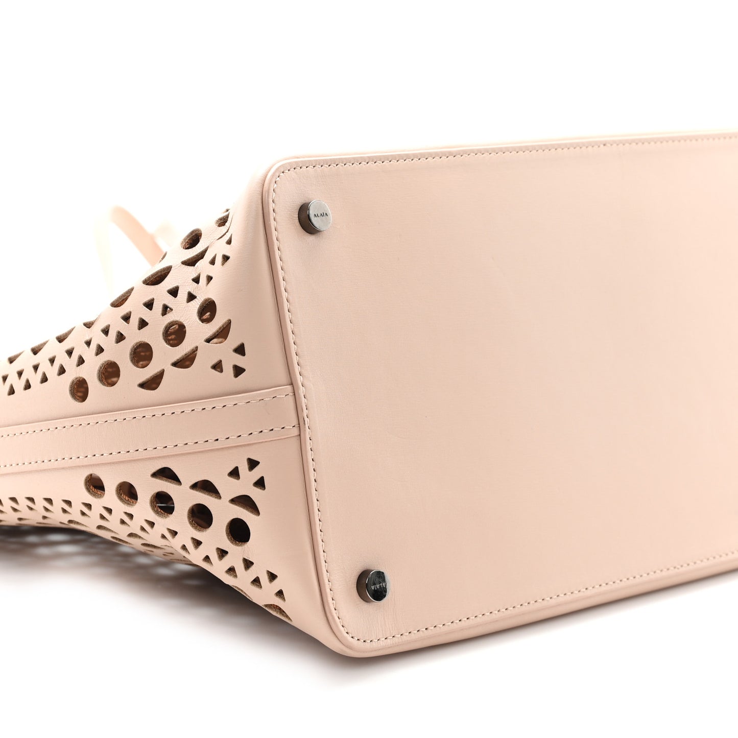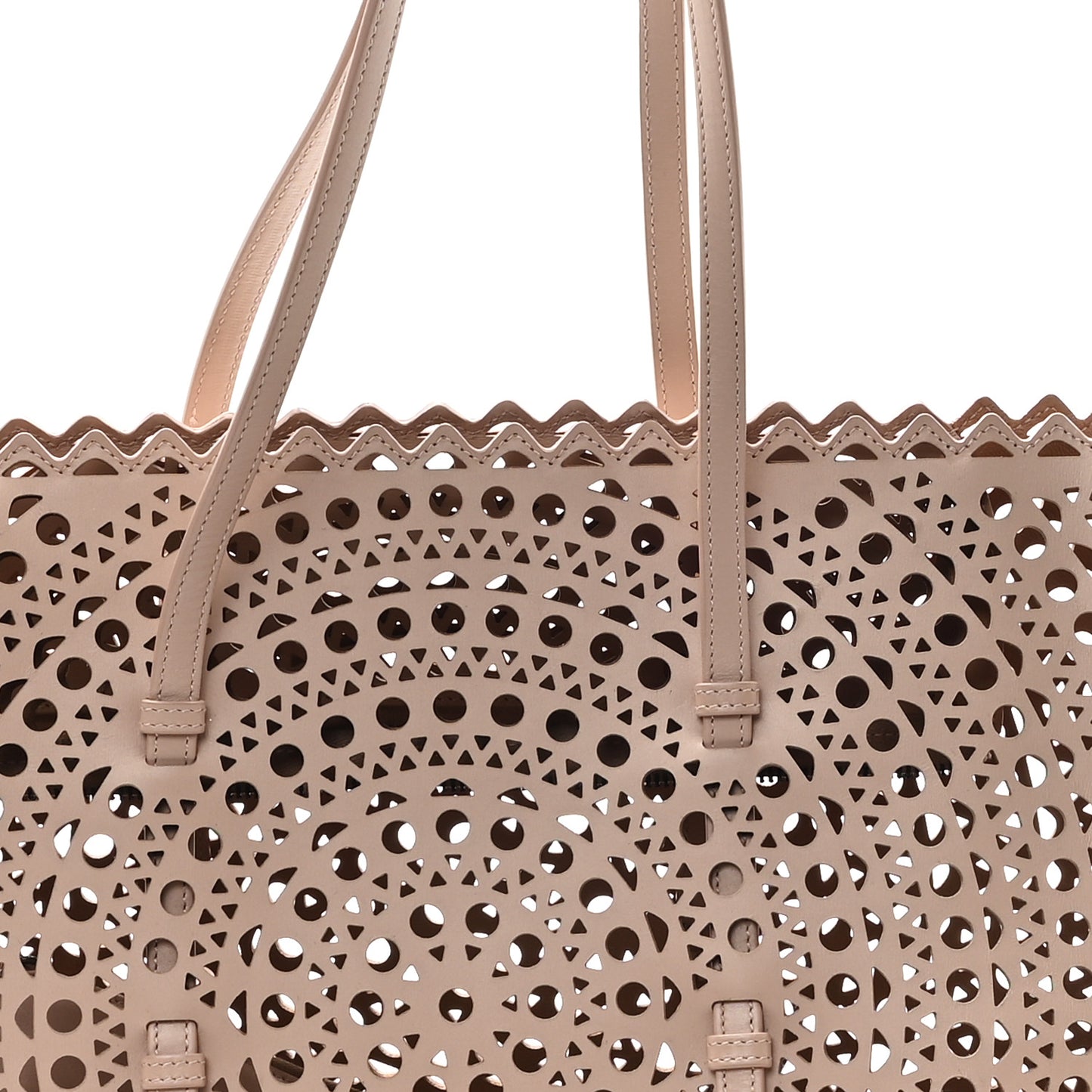This is an authentic ALAIA Calfskin Vienne Tote in Sable. This stylish tote is crafted of beige calfskin leather with a laser-cut design throughout. The bag features narrow leather top handles and a broad and the zip top reveals a beige leather interior with a removable zipper pouch and mirror.Follow this item for alerts. Alaia is a registered trademark of Alaia. FASHIONPHILE is not affiliated with Alaia.