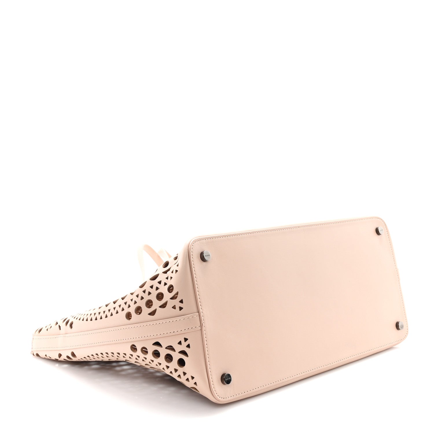 This is an authentic ALAIA Calfskin Vienne Tote in Sable. This stylish tote is crafted of beige calfskin leather with a laser-cut design throughout. The bag features narrow leather top handles and a broad and the zip top reveals a beige leather interior with a removable zipper pouch and mirror.Follow this item for alerts. Alaia is a registered trademark of Alaia. FASHIONPHILE is not affiliated with Alaia.