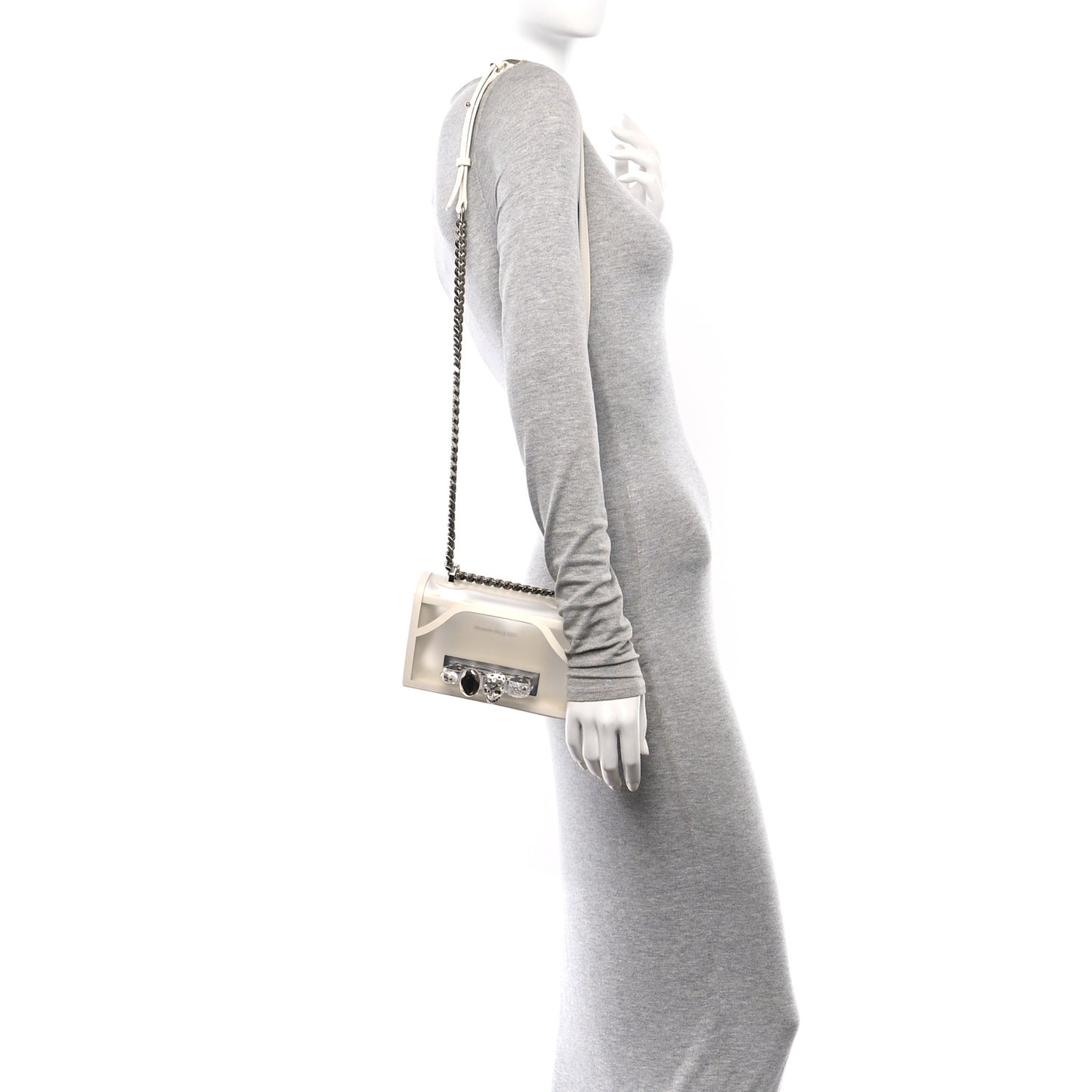 This is an authentic ALEXANDER MCQUEEN Calfskin Polyurethane Jeweled Knuckle Satchel in White. This chic shoulder bag is crafted of a transparent material in white. The bag features a polished silver chain shoulder strap with a smooth leather shoulder pad and the front flap features the signature Alexander McQueen skeletal knuckle embellishments.Follow this item for alerts. Alexander McQueen is a registered trademark of Alexander McQueen. FASHIONPHILE is not affiliated with Alexander McQueen.