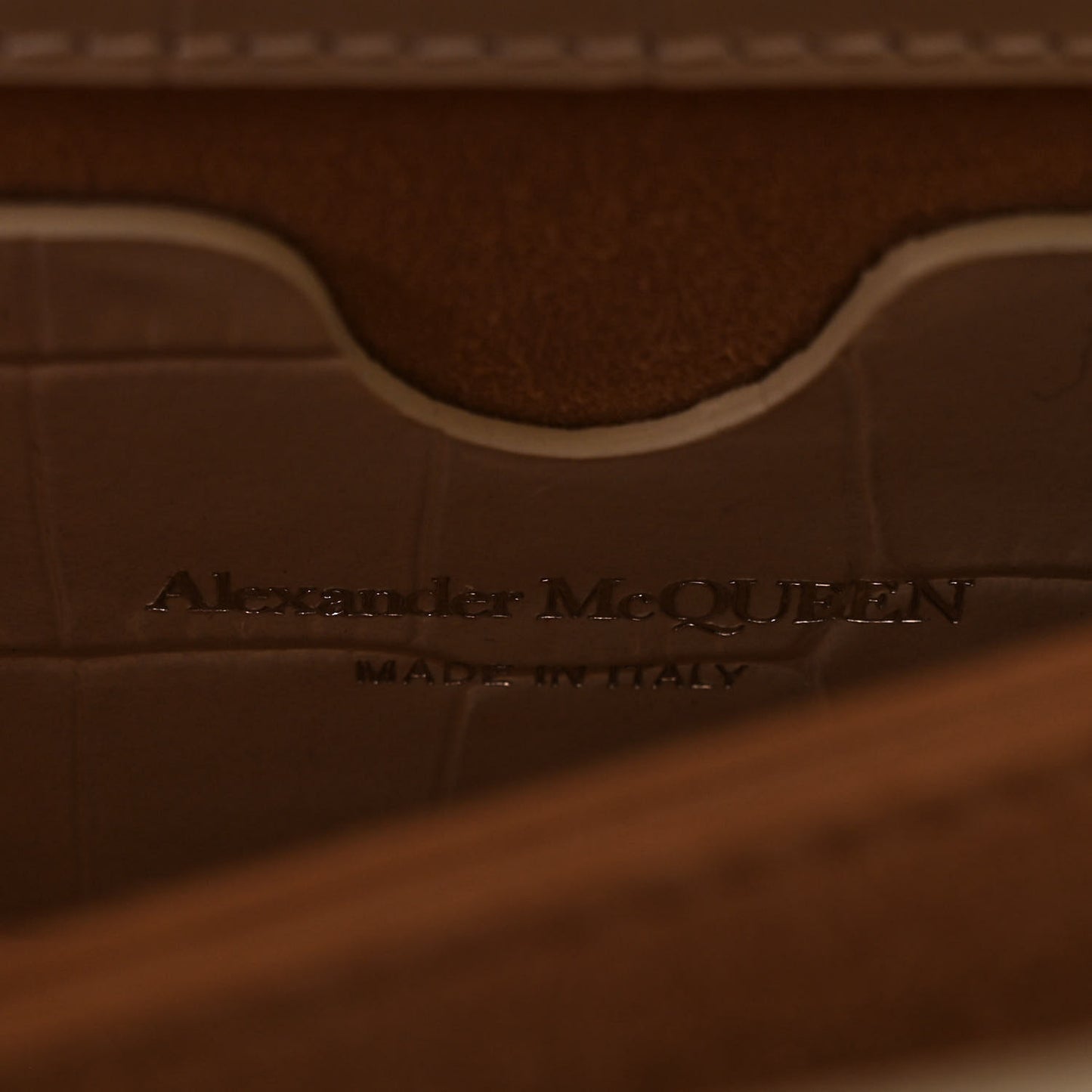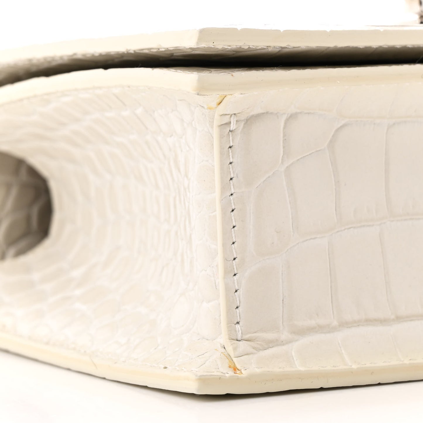 This is an authentic ALEXANDER MCQUEEN Shiny Calfskin Crocodile Embossed Knuckle Jeweled Crossbody in White. This chic bag is crafted of white crocodile-embossed calfskin. The bag features a silver chain shoulder strap with a leather shoulder pad and the front flap features the signature Alexander McQueen knuckle embellishments.Follow this item for alerts. Alexander McQueen is a registered trademark of Alexander McQueen. FASHIONPHILE is not affiliated with Alexander McQueen.