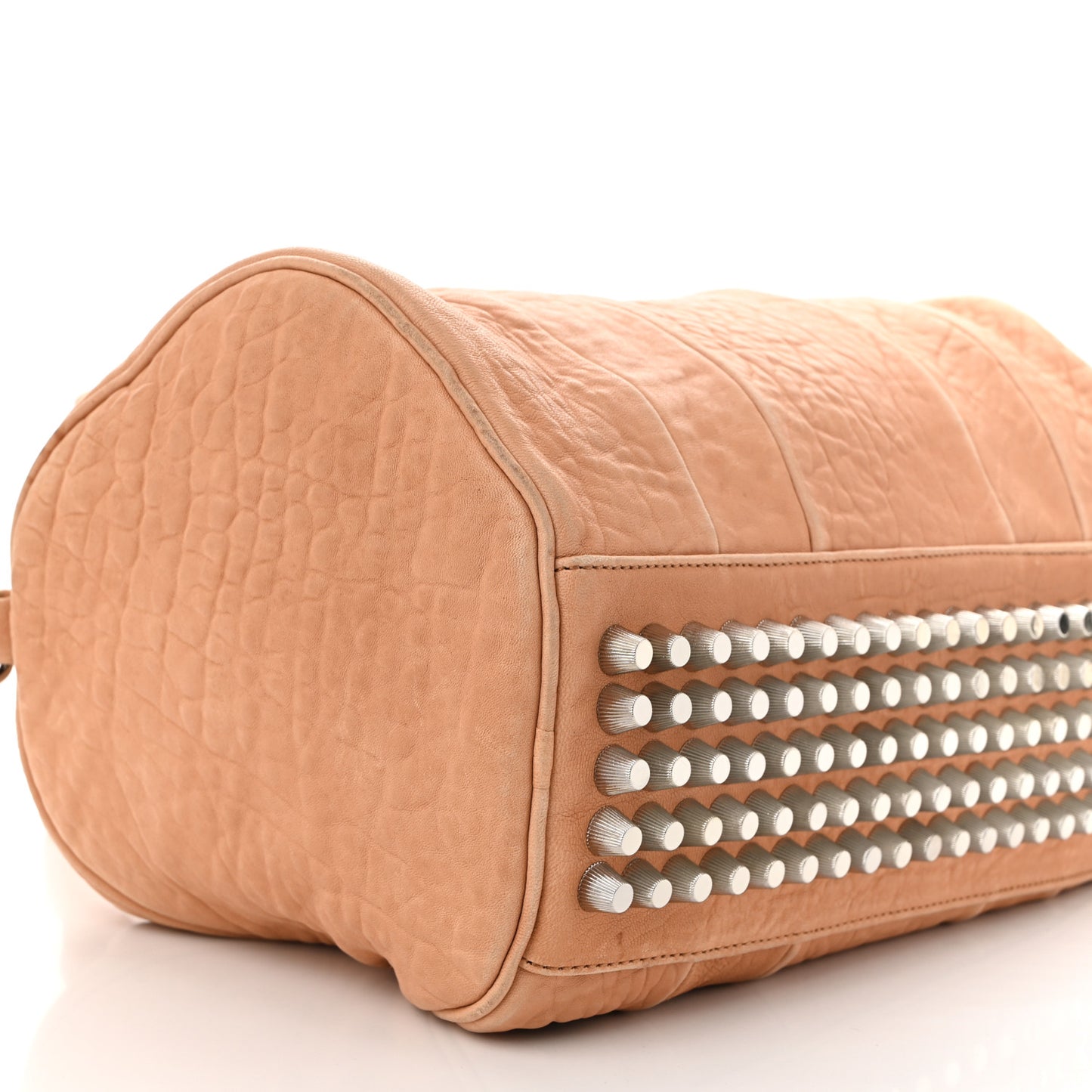 This is an authentic ALEXANDER WANG Pebbled Lambskin Rocco in Beige with Rhodium Hardware. This handbag is crafted of pebbled lambskin leather in light. beige. The bag features reinforced leather top handles, and an optional shoulder strap with a shoulder pad, and polished silver hardware. The base of the bag is completely covered in gold studs, and the top zipper opens to a black nylon fabric interior with zipper and patch pockets.Follow this item for alerts. Alexander Wang is a registered trademark of Alexander Wang. FASHIONPHILE is not affiliated with Alexander Wang.