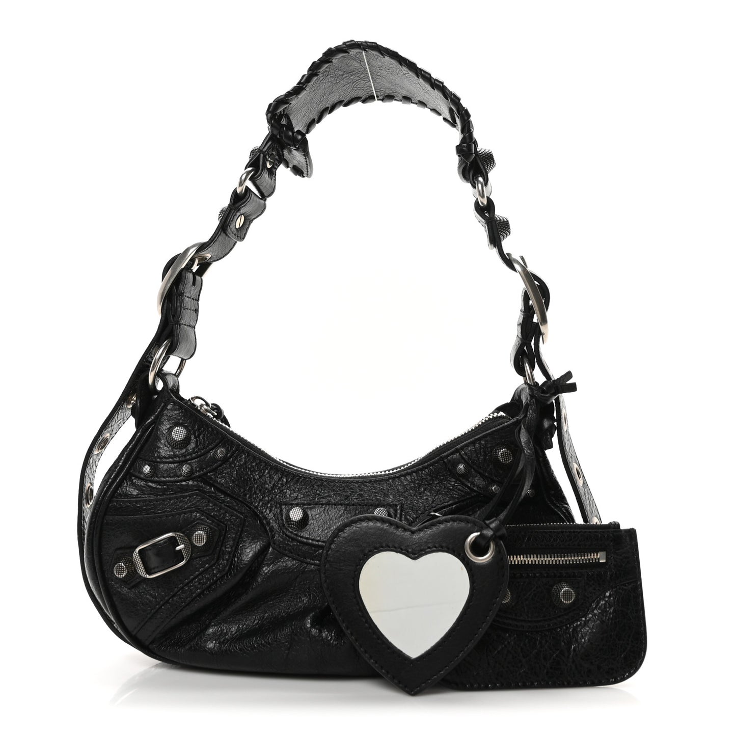 This is an authentic BALENCIAGA Agneau Arena Le Cagole Shoulder Bag XS in Black. This stylish and structured handbag is crafted of distressed lambskin leather in black. The bag features a sturdy leather top handle with silver links and a top zipper, and an adjustable shoulder strap. The top unzips to a black fabric compact interior and includes a removable pouch and heart shaped mirror.Follow this item for alerts. Balenciaga is a registered trademark of Balenciaga. FASHIONPHILE is not affiliated with Balenciaga.