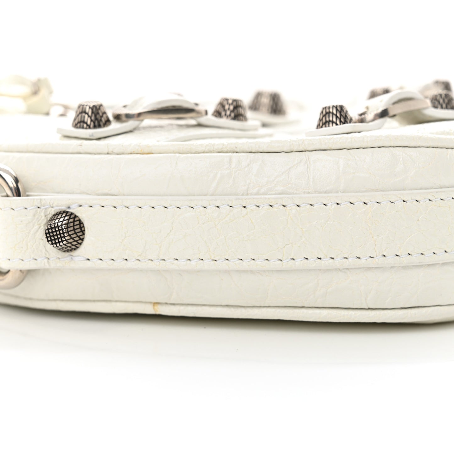 This is an authentic BALENCIAGA Agneau Arena Le Cagole Mini Heart Bag in Optic White. This bag is crafted in white leather in the shape of a heart and features the signature silver decorative studs and buckles. This bag also features a silver chain shoulder strap and front zipper pocket. The top zipper opens to a black fabric interior with card slots.Follow this item for alerts. Balenciaga is a registered trademark of Balenciaga. FASHIONPHILE is not affiliated with Balenciaga.