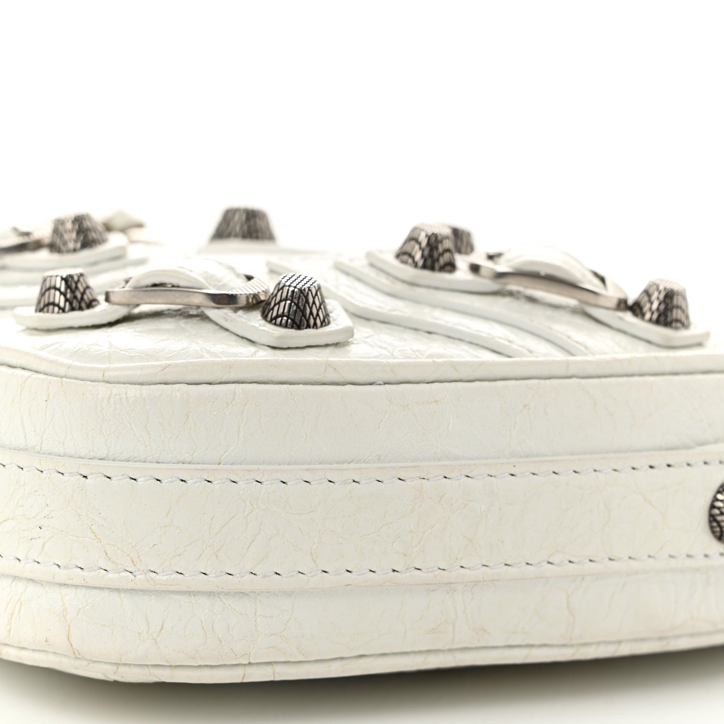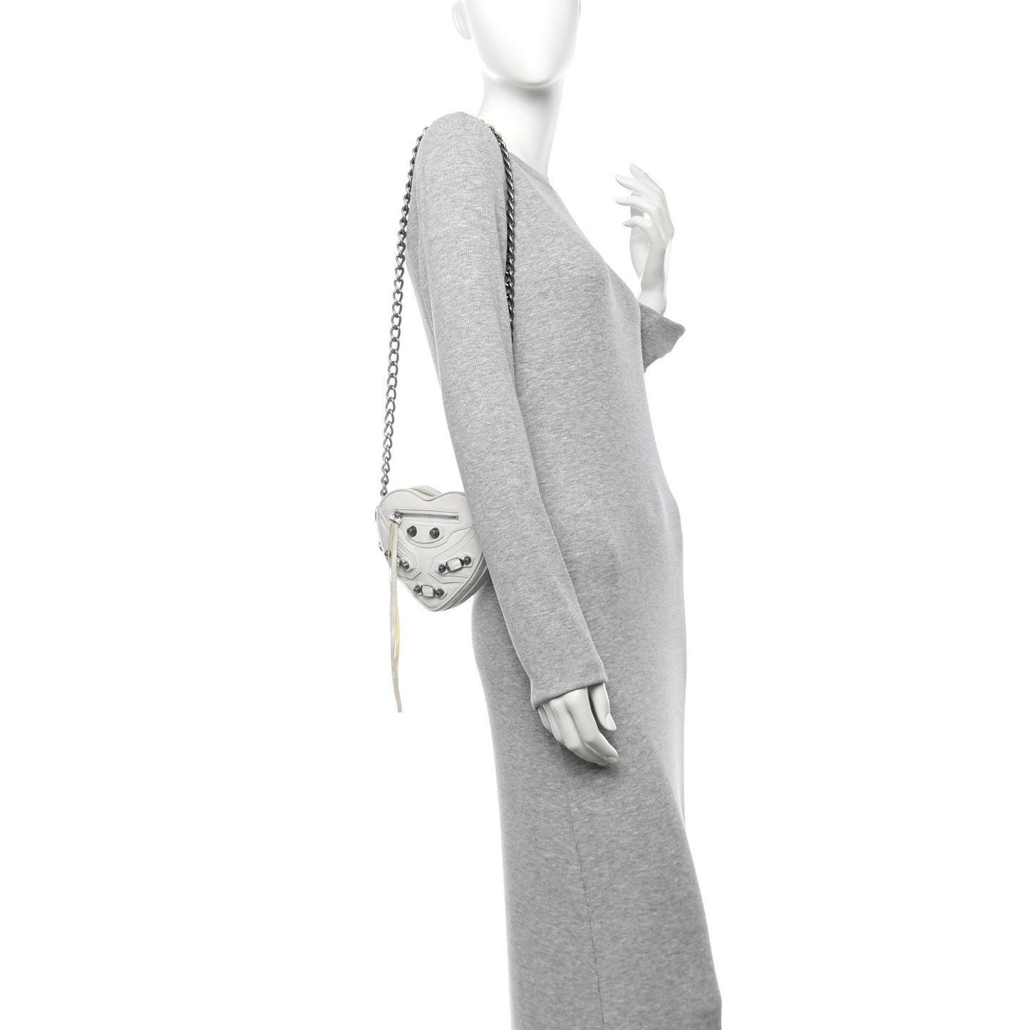 This is an authentic BALENCIAGA Agneau Arena Le Cagole Mini Heart Bag in Optic White. This bag is crafted in white leather in the shape of a heart and features the signature silver decorative studs and buckles. This bag also features a silver chain shoulder strap and front zipper pocket. The top zipper opens to a black fabric interior with card slots.Follow this item for alerts. Balenciaga is a registered trademark of Balenciaga. FASHIONPHILE is not affiliated with Balenciaga.