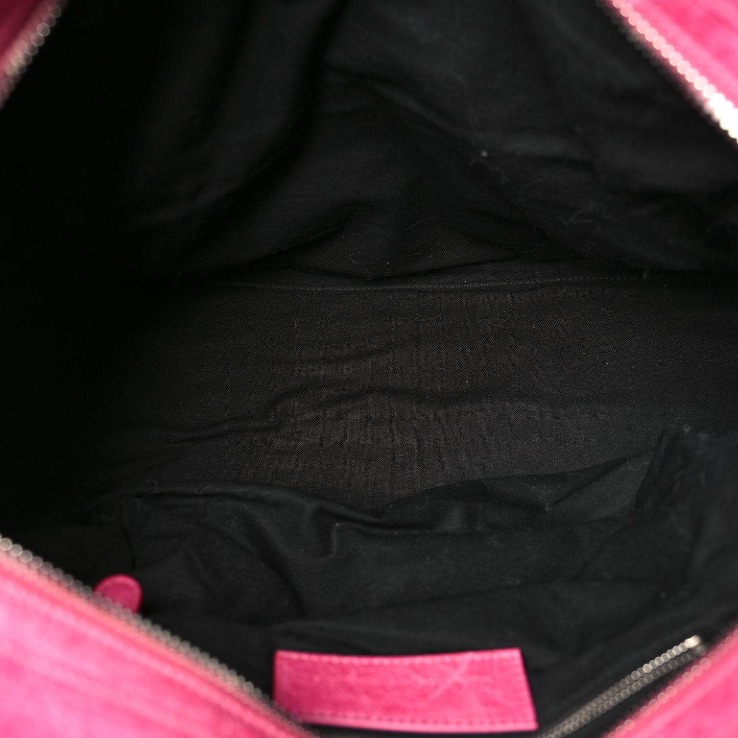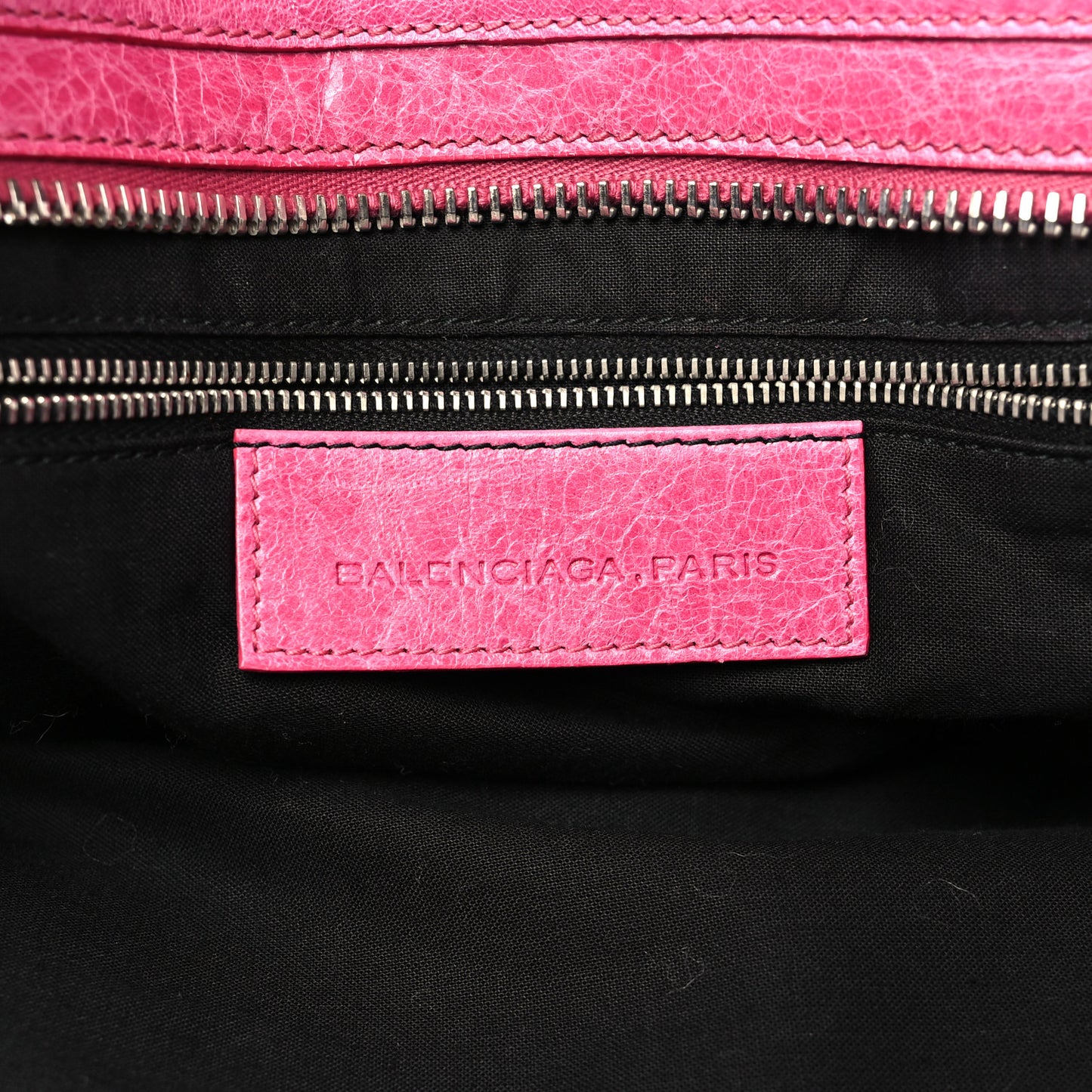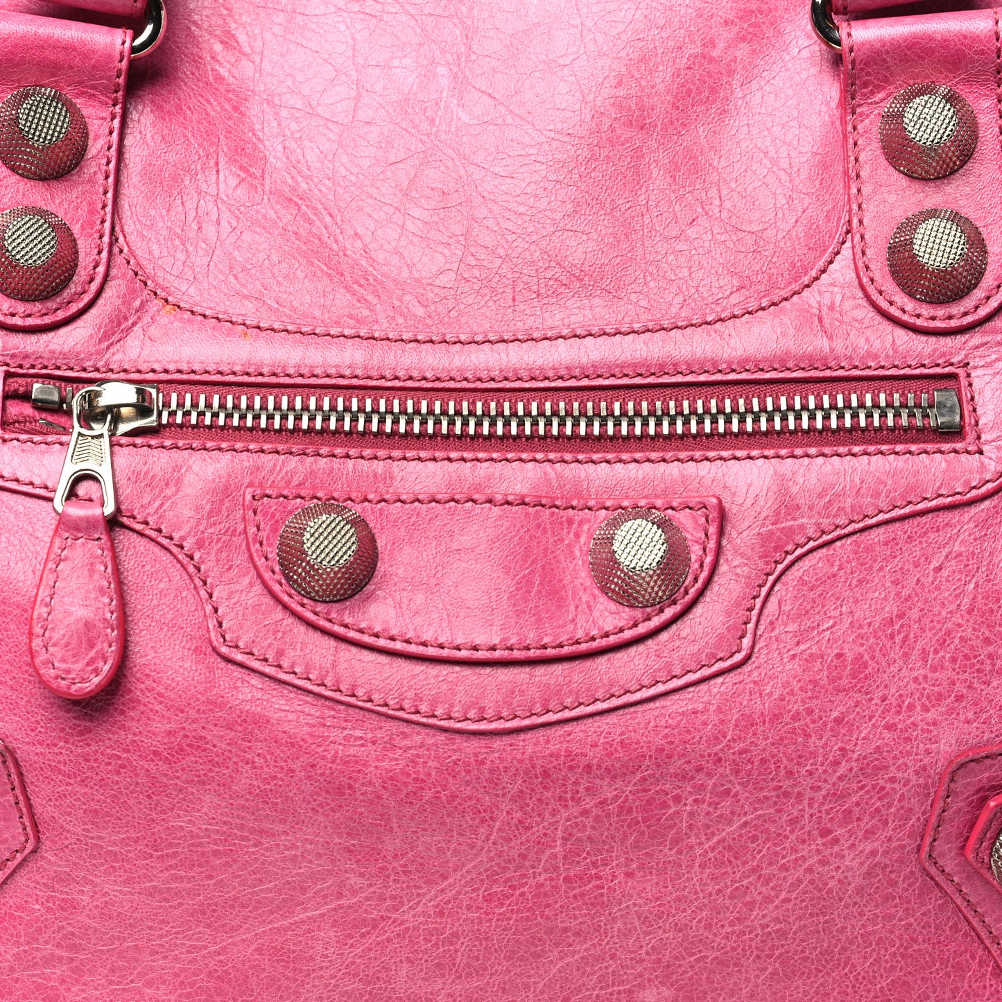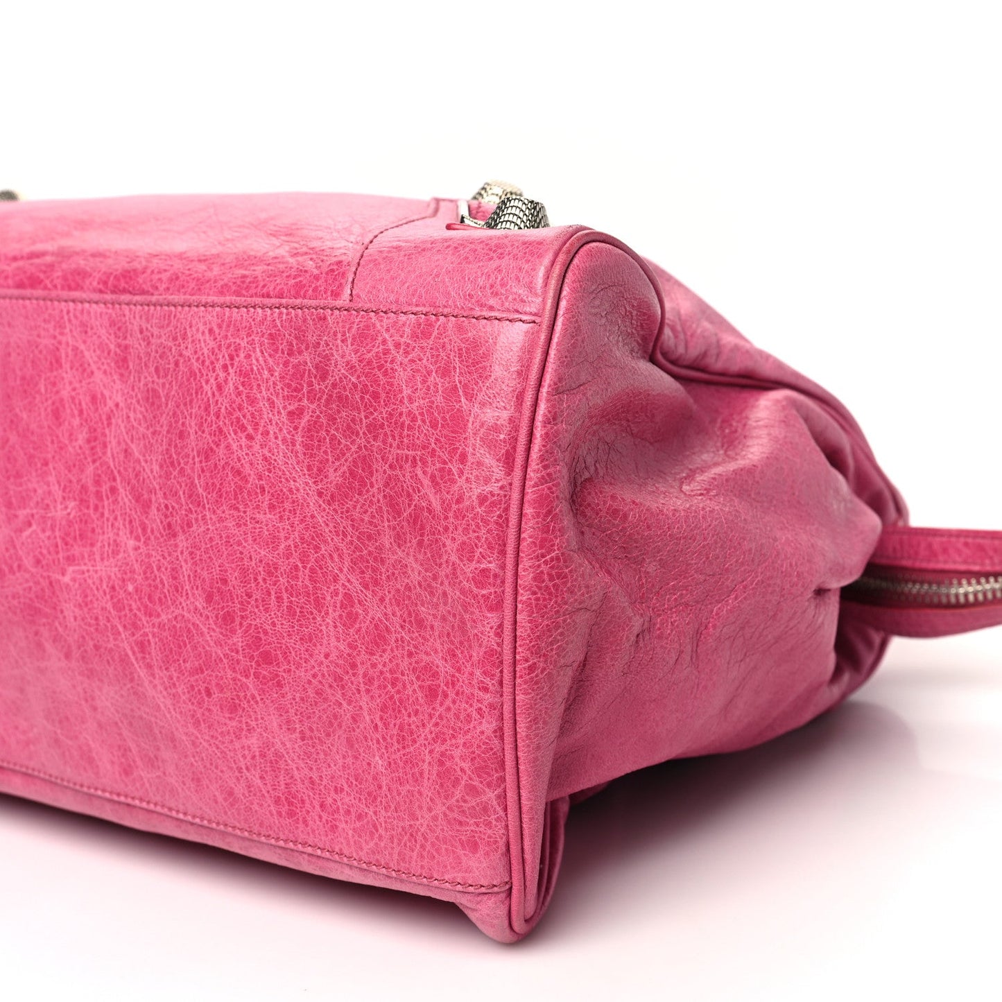 This is an authentic BALENCIAGA Agneau Giant 21 Silver Mid Day in Sorbet. This handbag is crafted of textured lambskin leather in pink with oversized silver hardware studs and buckles. It features rolled leather top handles with whipstitch detailing and a front zippered pocket with removable mirror. The top zipper opens to a black fabric interior with a zippered pocket.Follow this item for alerts. Balenciaga is a registered trademark of Balenciaga. FASHIONPHILE is not affiliated with Balenciaga.