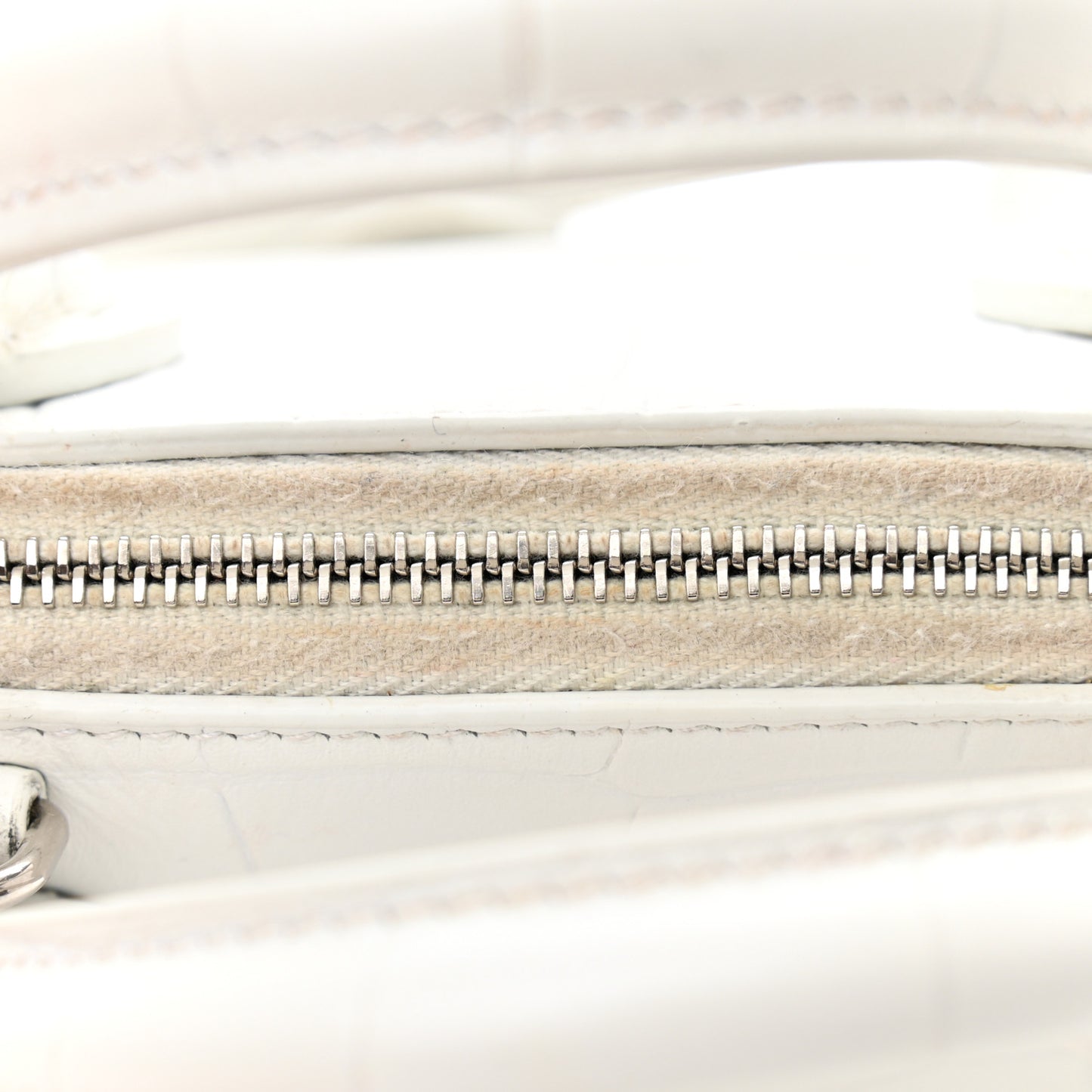 This is an authentic BALENCIAGA Calfskin Crocodile Embossed XXS Ville Top Handle Bag in White. This fine handbag is crafted of luxuriously white calfskin leather. The bag features rolled top handles and a leather shoulder strap. The top is open to black leather and fabric interior with patch pockets.Follow this item for alerts. Balenciaga is a registered trademark of Balenciaga. FASHIONPHILE is not affiliated with Balenciaga.