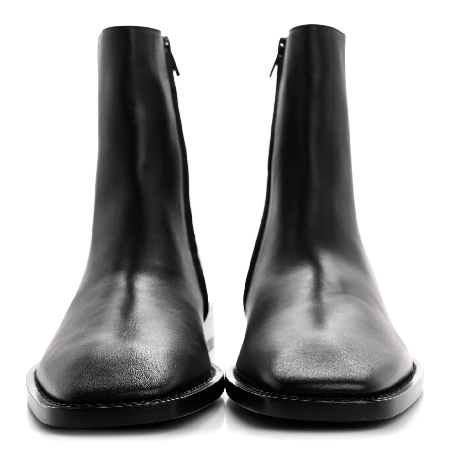 This is an authentic pair of BALENCIAGA Calfskin Mens Soft Rim Ankle Booties size 40 in Black. These boots are crafted of smooth black leather. The booties feature a squared toe and side zipper.Follow this item for alerts. Balenciaga is a registered trademark of Balenciaga. FASHIONPHILE is not affiliated with Balenciaga.