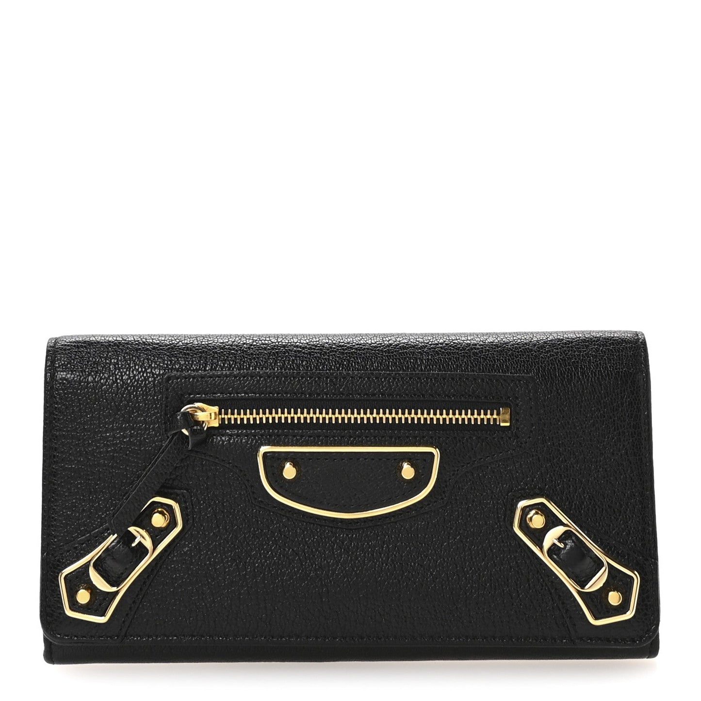 This is an authentic BALENCIAGA Chevre Gold Metallic Edge Hardware Money Wallet in Black. This chic wallet is finely crafted of black goatskin leather with the features of the classic Balenciaga totes including a facing zipper pocket, leather belts and patches, and classic gold hardware including buckles, studs, and a signature zipper. The snap opens to a matching leather interior with credit card slots, pockets, and a zippered coin compartment.Follow this item for alerts. Balenciaga is a registered trademark of Balenciaga. FASHIONPHILE is not affiliated with Balenciaga.