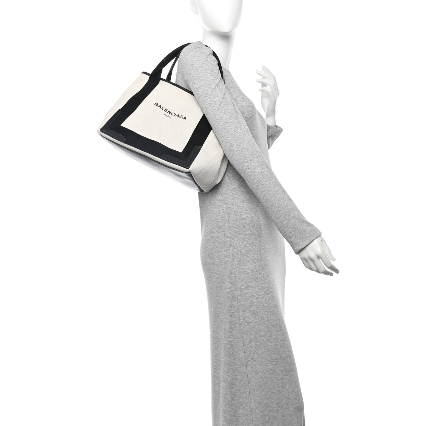 This is an authentic BALENCIAGA Cotton Canvas Satin Calfskin S Navy Cabas in Natural and Black. This impressive tote is crafted of a fine ivory canvas and black leather trim. This hand bag features black nylon accents that extend into top handles with leather grips and a BALENCIAGA logo. The top is open to a coarse black linen interior with a matching removable pouch.Follow this item for alerts. Balenciaga is a registered trademark of Balenciaga. FASHIONPHILE is not affiliated with Balenciaga.
