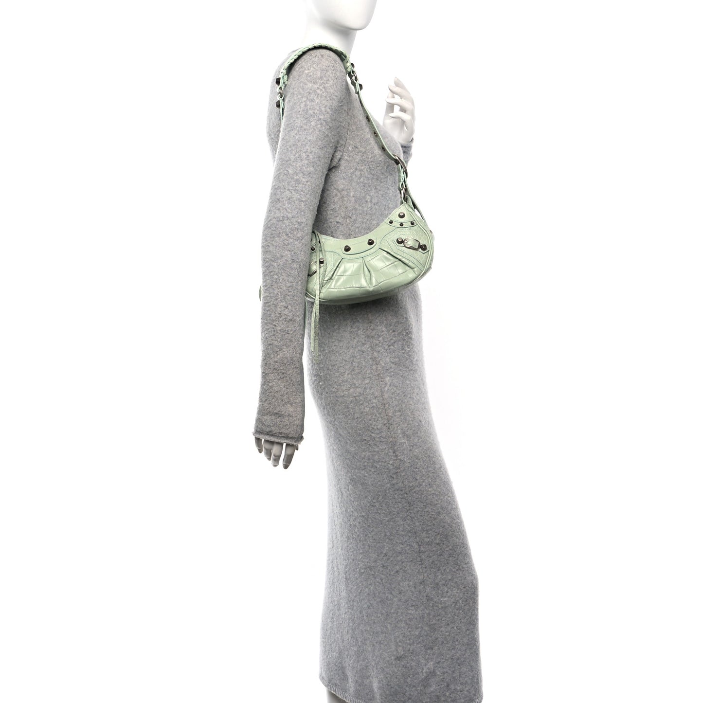 This is an authentic BALENCIAGA Extra Supple Calfskin Crocodile Embossed Le Cagole Shoulder Bag XS in Light Green. This handbag is crafted of light green crocodile embossed calfskin leather and. ruthenium hardware. This bag features an adjustable leather strap, a removable mirror and a removable coin purse. The top opens to a black fabric interiorFollow this item for alerts. Balenciaga is a registered trademark of Balenciaga. FASHIONPHILE is not affiliated with Balenciaga.