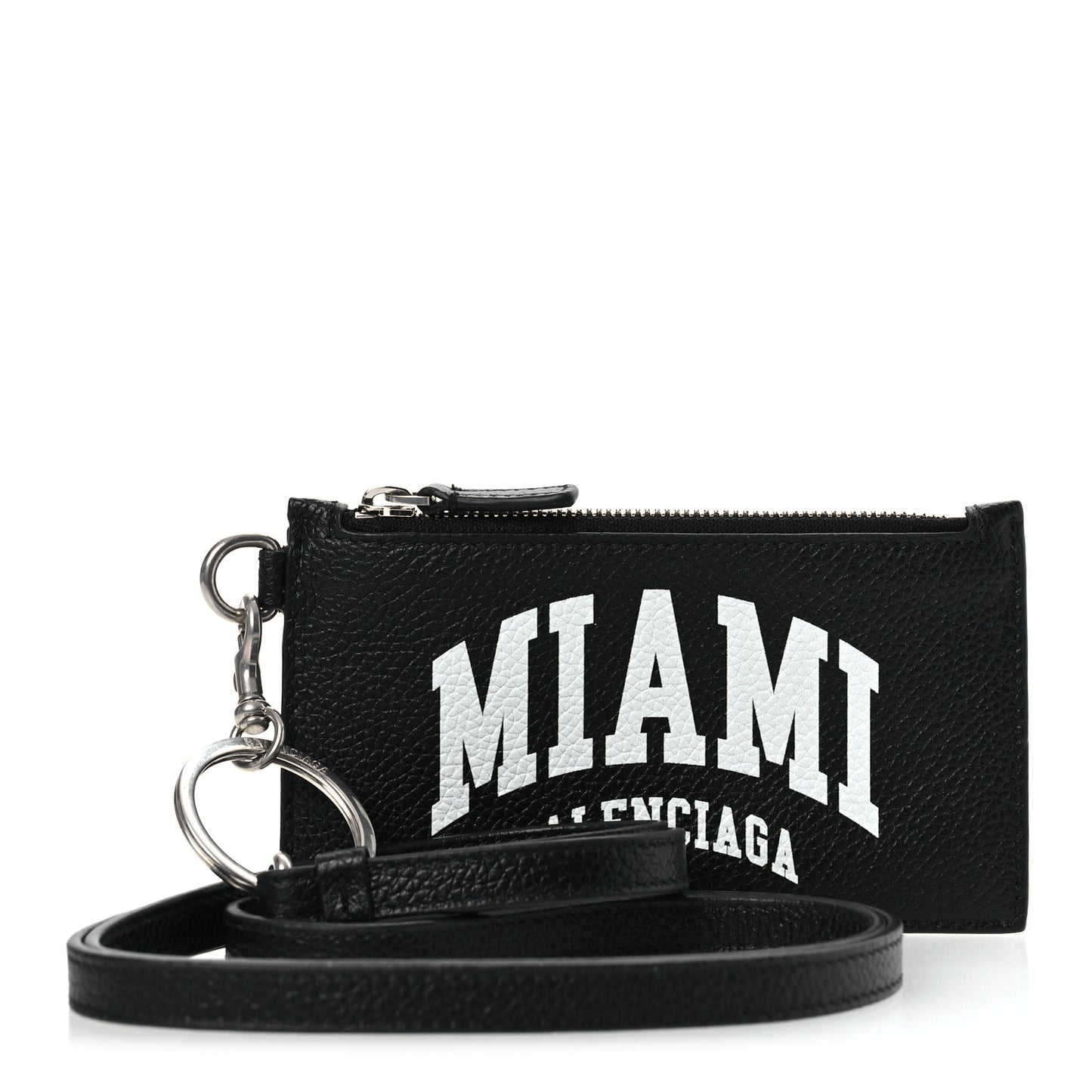 This is an authentic BALENCIAGA Grained Calfskin Miami Logo Cash Coin Card Holder On Keychain in Black. This stylish cardholder is crafted in a black leather exterior. This wallet features MIAMI BALENCIAGA in white print across the front, card slots on the reverse, and silver hardware. The top zipper opens to a matching leather interior.Follow this item for alerts. Balenciaga is a registered trademark of Balenciaga. FASHIONPHILE is not affiliated with Balenciaga.