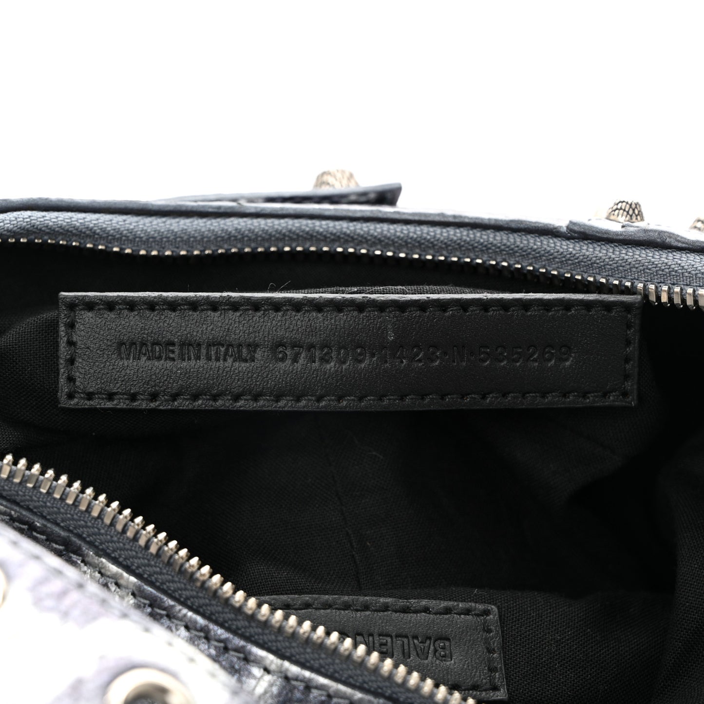 This is an authentic BALENCIAGA Metallic Agneau Arena Leopard Le Cagole Shoulder Bag XS in Dark Grey. This stylish petite handbag is beautifully crafted of dark grey metallic arena lambskin with a leopard print. It features an adjustable shoulder strap, mirror. This bag also features the signature Balenciaga decorative hardware, belts, buckles and aged silver studs. The top zipper opens to a black fabric interior.Follow this item for alerts. Balenciaga is a registered trademark of Balenciaga. FASHIONPHILE is not affiliated with Balenciaga.