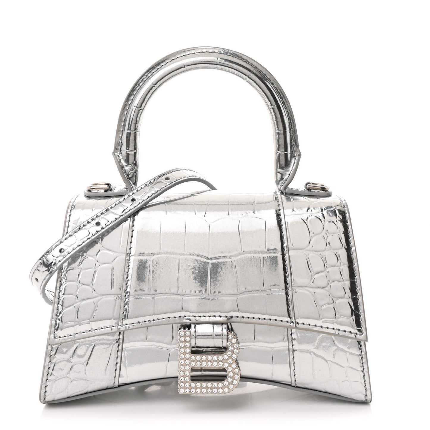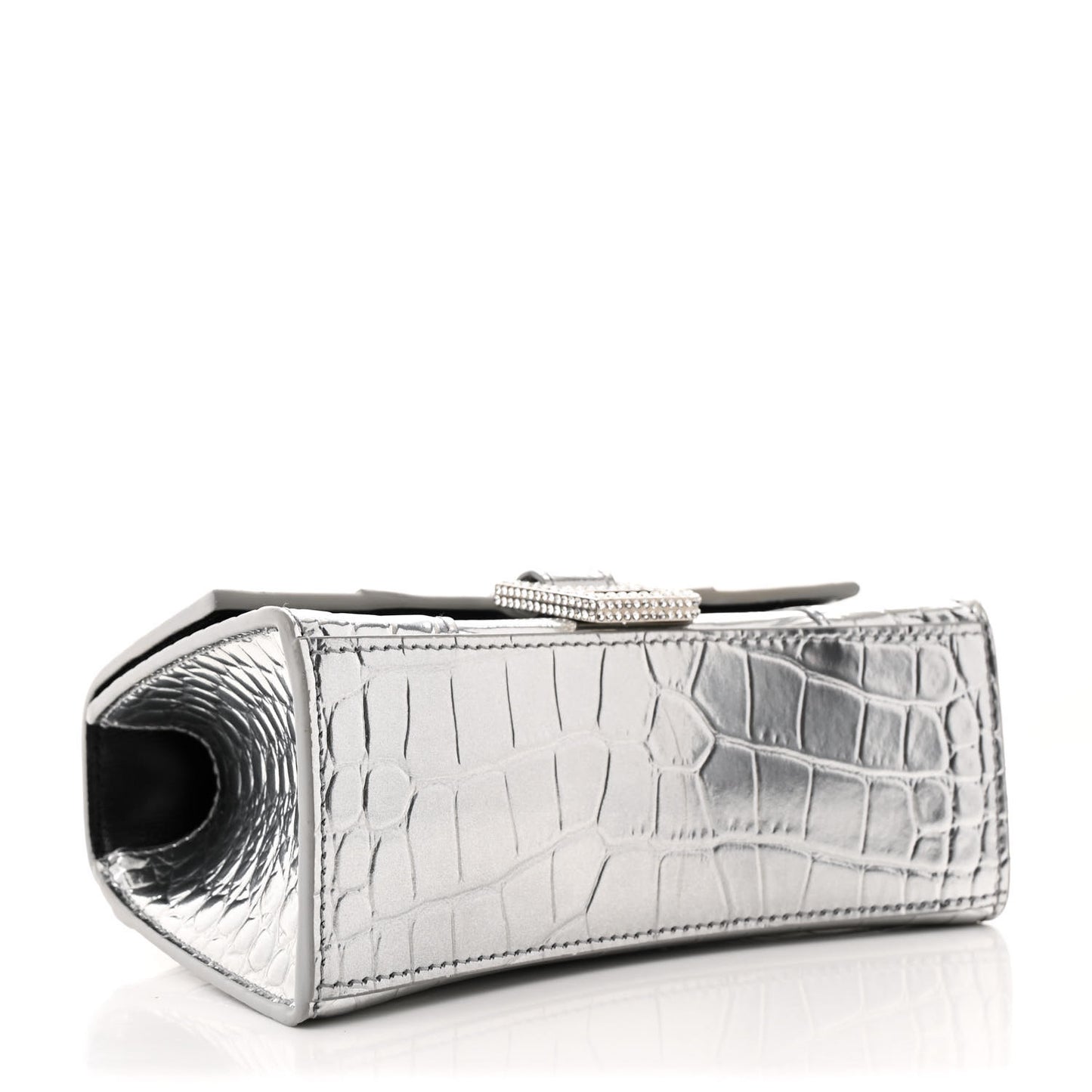 Balenciaga/ Bags/ Clutch & Evening /Balenciaga Metallic Calfskin Crocodile Embossed Crystal Hourglass Top Handle Bag XS Silver