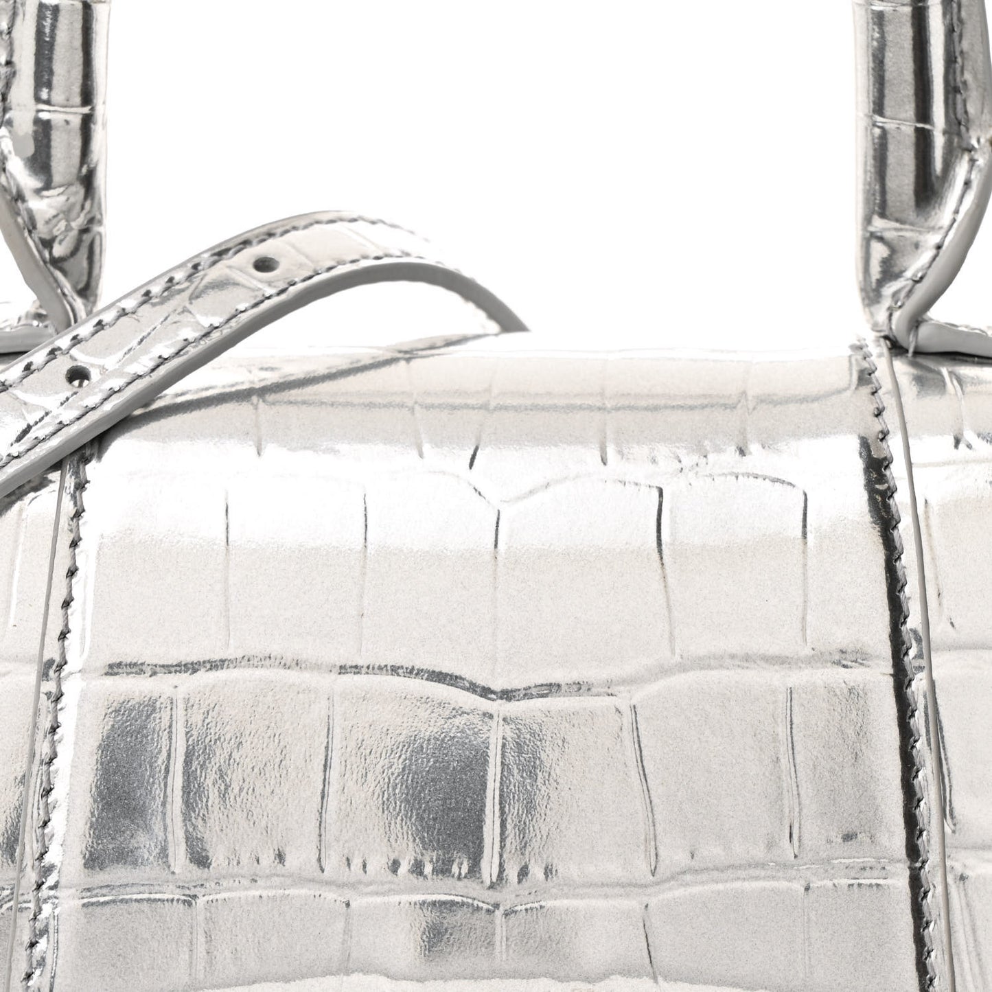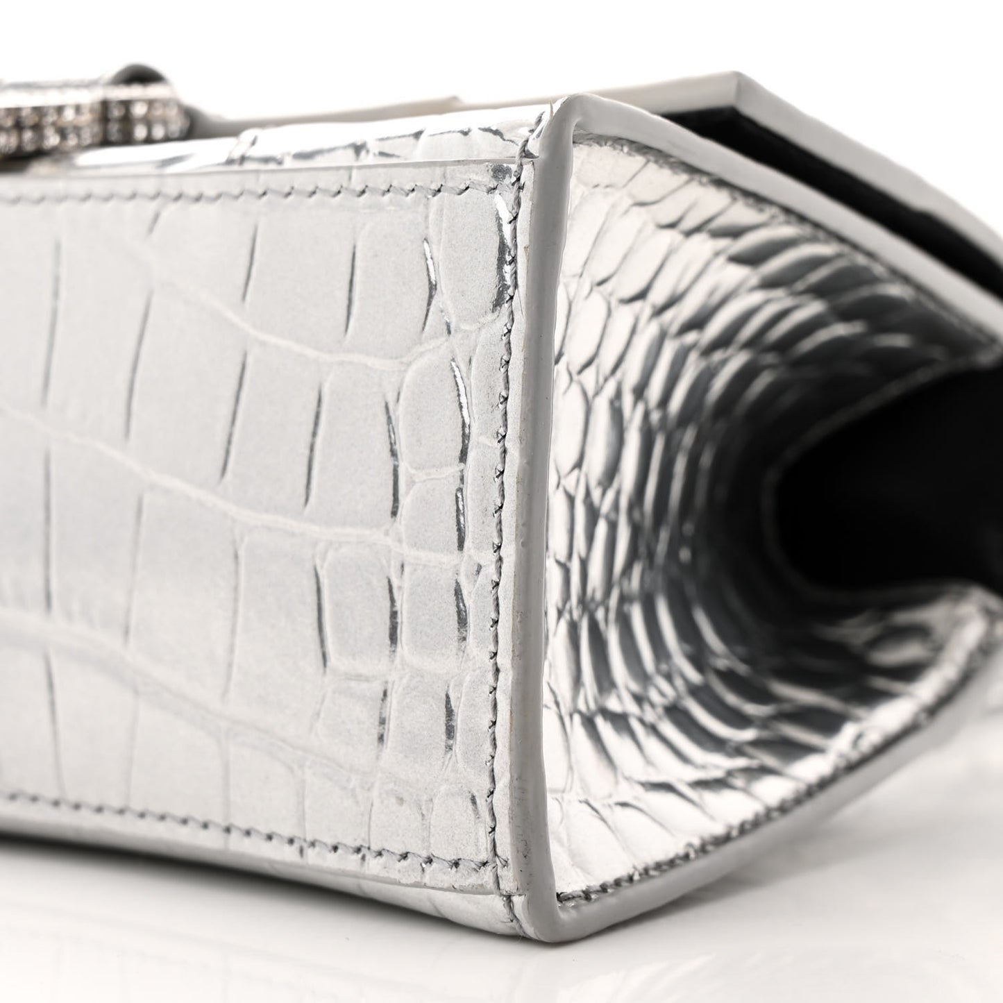 Metallic Calfskin Crocodile Embossed Crystal Hourglass Top Handle Bag XS Silver