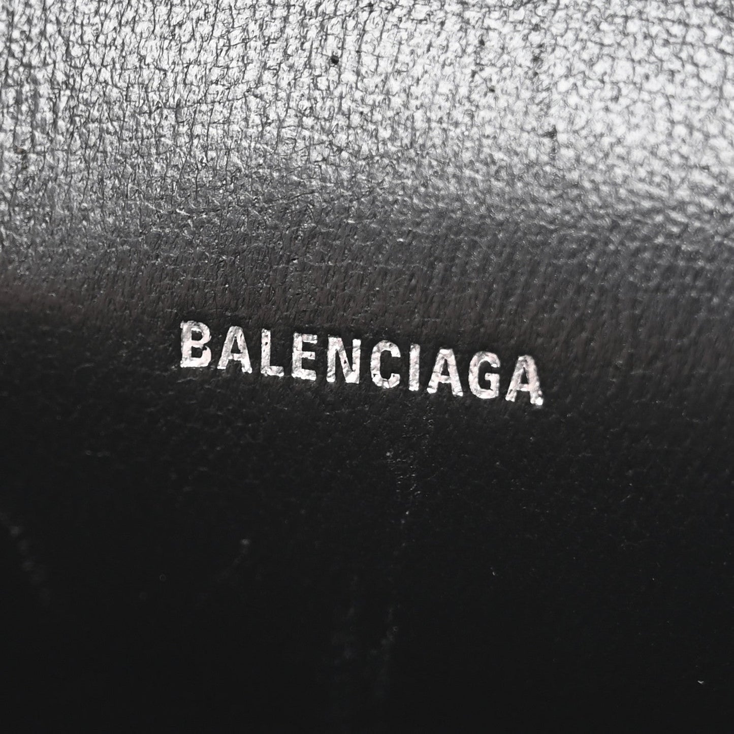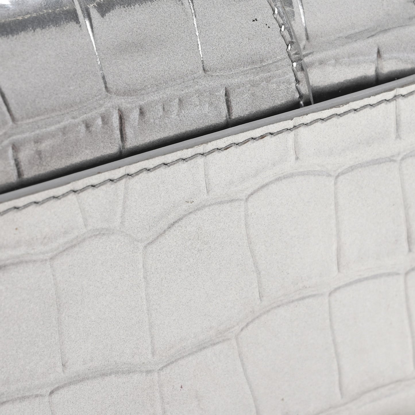 This is an authentic BALENCIAGA Shiny Calfskin Crocodile Embossed Hourglass Chain Cardholder in Metallic. This stylish and structured cardholder is crafted of crocodile embossed silver calfskin leather. The bag features a prominent B logo on the front flap and a silver key ring. The front flap opens with a magnetic snap closure to a smooth black leather compact interior.Follow this item for alerts. Balenciaga is a registered trademark of Balenciaga. FASHIONPHILE is not affiliated with Balenciaga.