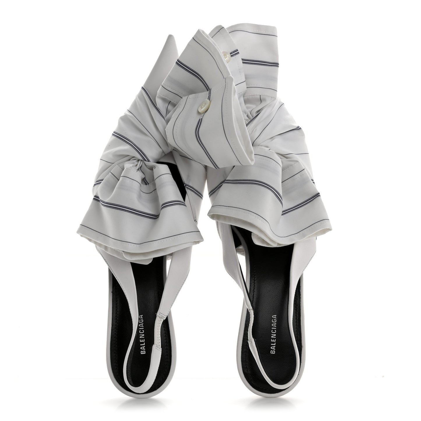 Balenciaga/ Accessories/ Shoes /Balenciaga Nappa Stripe Poplin Pointed Toe Knife Chemise Slingback Mules 38.5 White Navy