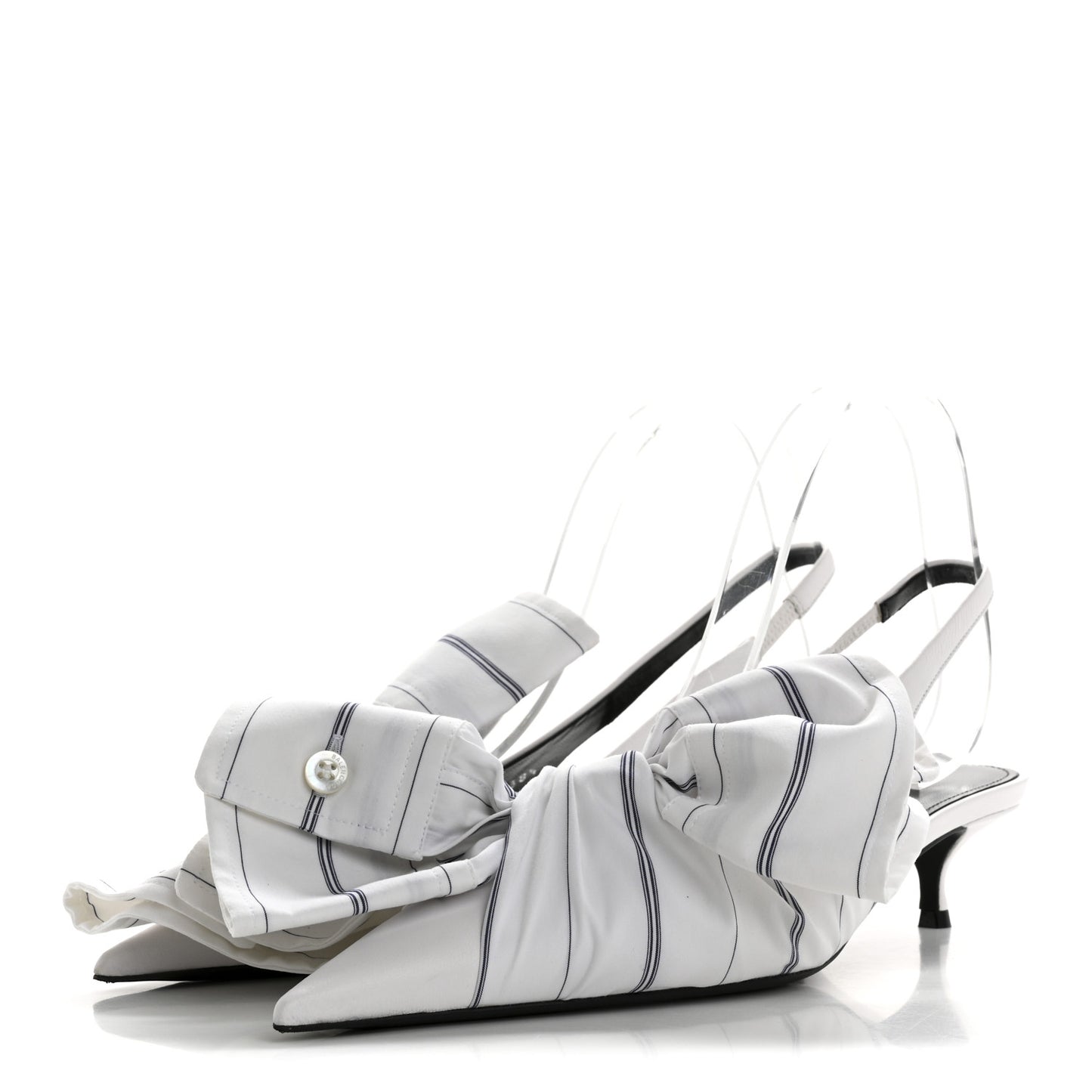 This is an authentic pair of BALENCIAGA Nappa Stripe Poplin Pointed Toe Knife Chemise Slingback Mules size 38.5 in White and Navy These eye-catching pumps are crafted of white and blue striped blouse fabric with a bow at the elongated pointed toe and a 3-inch stiletto heel.Follow this item for alerts. Balenciaga is a registered trademark of Balenciaga. FASHIONPHILE is not affiliated with Balenciaga.
