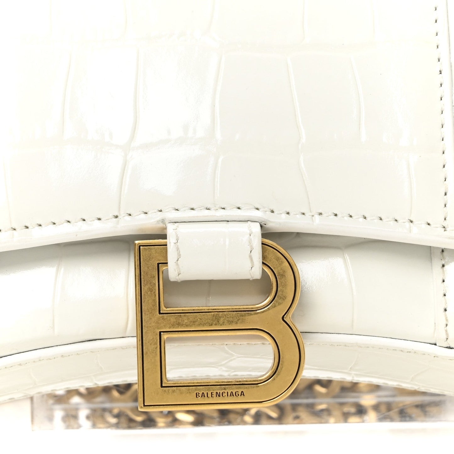 This is an authentic BALENCIAGA Shiny Calfskin Crocodile Embossed Hourglass Chain Bag in White. This stylish petite handbag is beautifully crafted of crocodile embossed calfskin leather in white. It features an optional shoulder strap. This bag also features the signature Balenciaga B charm, aged gold hardware, and a slip pocket at back. The front flap opens to a leather interior with card slots and a zipper pocket.Follow this item for alerts. Balenciaga is a registered trademark of Balenciaga. FASHIONPHILE is not affiliated with Balenciaga.