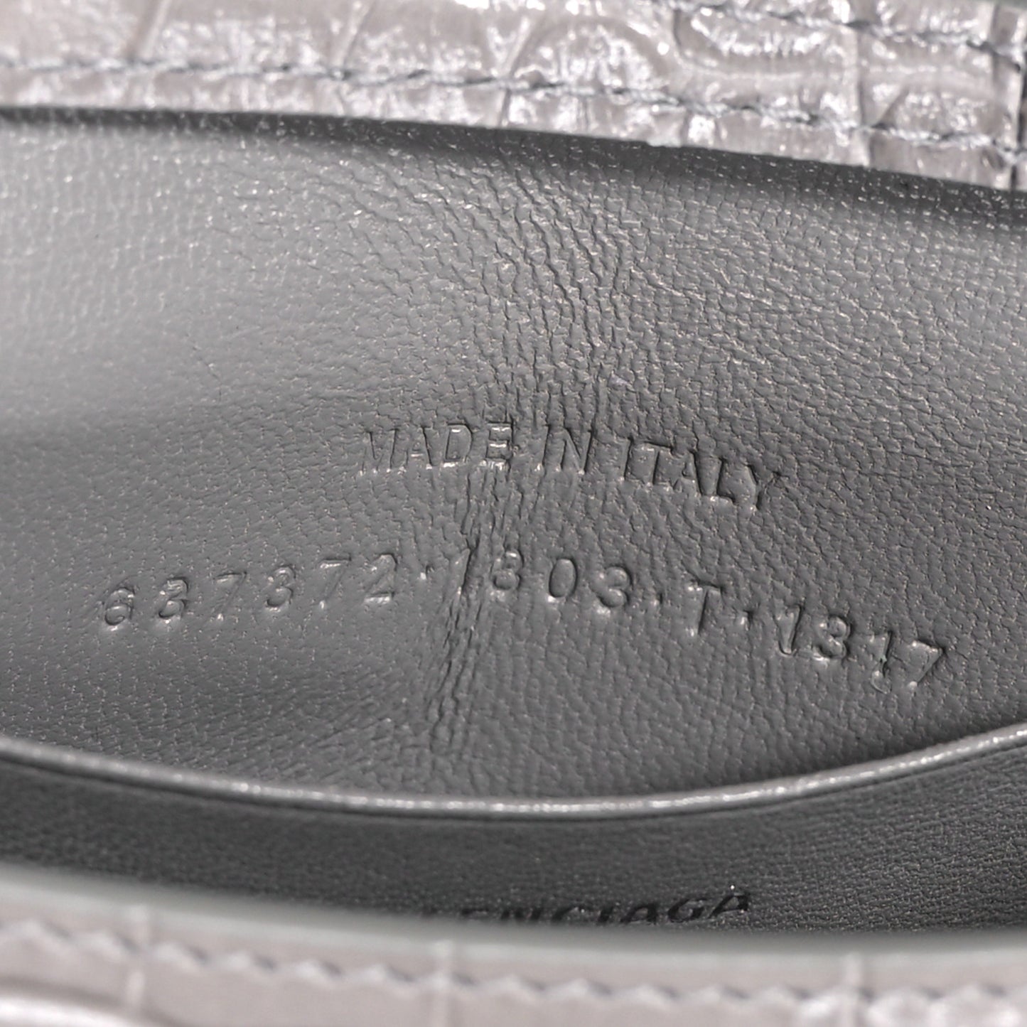 This is an authentic BALENCIAGA Shiny Calfskin Crocodile Embossed Hourglass Top Handle Bag Mini in Steel Grey. This stylish and structured handbag is crafted of crocodile embossed grey calfskin leather. The bag features a sturdy leather top handle, a prominent B logo on the front flap, and an optional adjustable shoulder strap. The front flap opens with a magnetic snap closure to a smooth grey leather interior with a patch pocket.Follow this item for alerts. Balenciaga is a registered trademark of Balenciaga. FASHIONPHILE is not affiliated with Balenciaga.