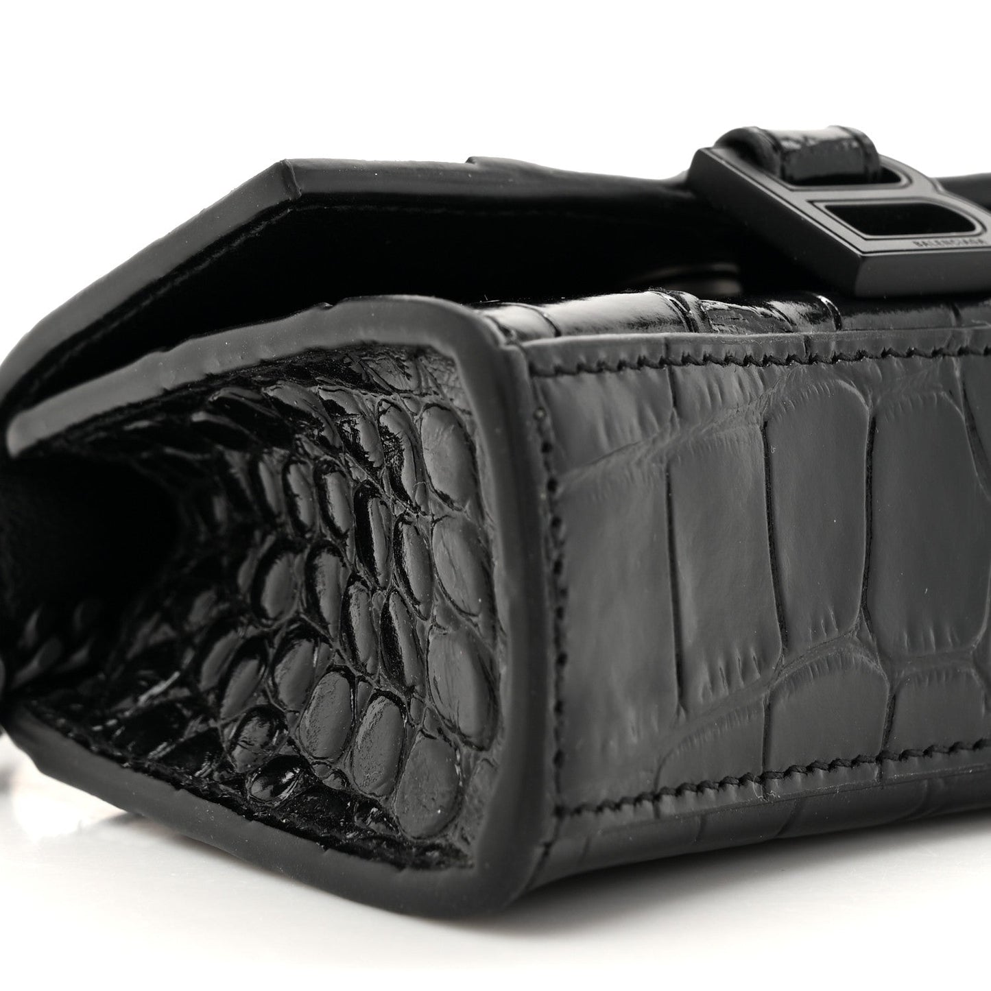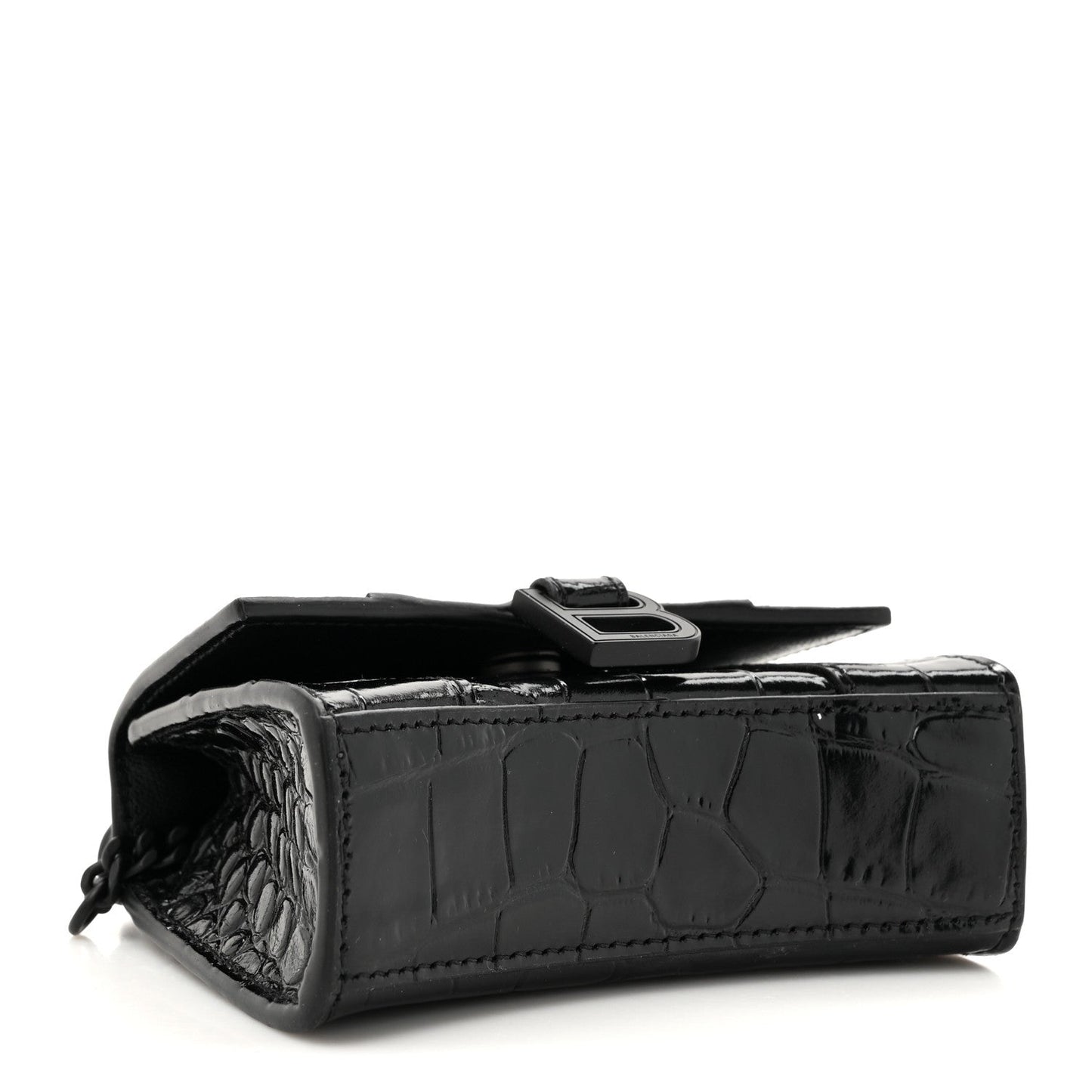 Balenciaga/ Bags/ Shoulder Bags /Balenciaga Shiny Calfskin Monochrome Crocodile Embossed Hourglass Top Handle Bag Mini with Chain Black