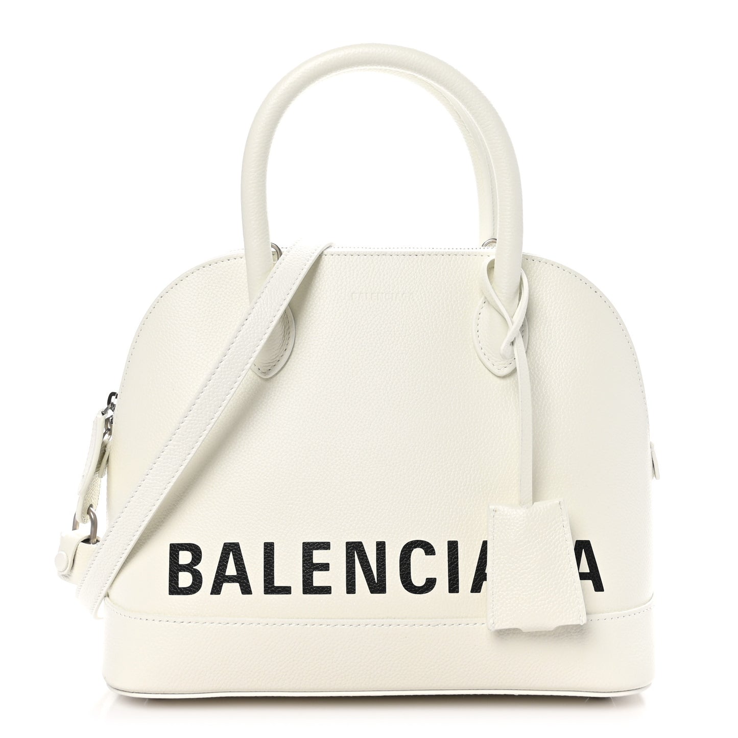 This is an authentic BALENCIAGA Grained Calfskin S Ville Top Handle Bag in White. This fine handbag is crafted in a luxurious white calfskin leather with a large Balenciaga logo in black on the front. The bag features rolled top handles, a leather shoulder strap, a top zip opening featuring a lock & 2 keys. This bag opens to a black fabric interior with a patch and zipper pocket.Follow this item for alerts. Balenciaga is a registered trademark of Balenciaga. FASHIONPHILE is not affiliated with Balenciaga.