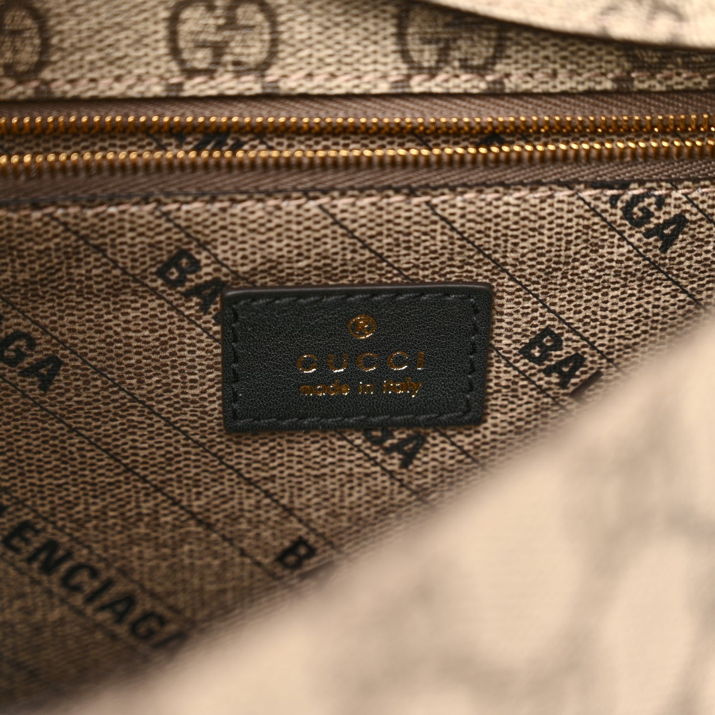 This is an authentic BALENCIAGA X GUCCI GG Supreme Monogram Medium Hourglass Top Handle Bag in Beige and Ebony. This stylish petite handbag is beautifully crafted with the Gucci monogram on coated canvas. It features a top handle and the signature Balenciaga B charm, gold hardware and slip pocket at back. The front flap opens to a beige Balenciaga monogrammed coated canvas interior.Follow this item for alerts. Balenciaga is a registered trademark of Balenciaga. FASHIONPHILE is not affiliated with Balenciaga.