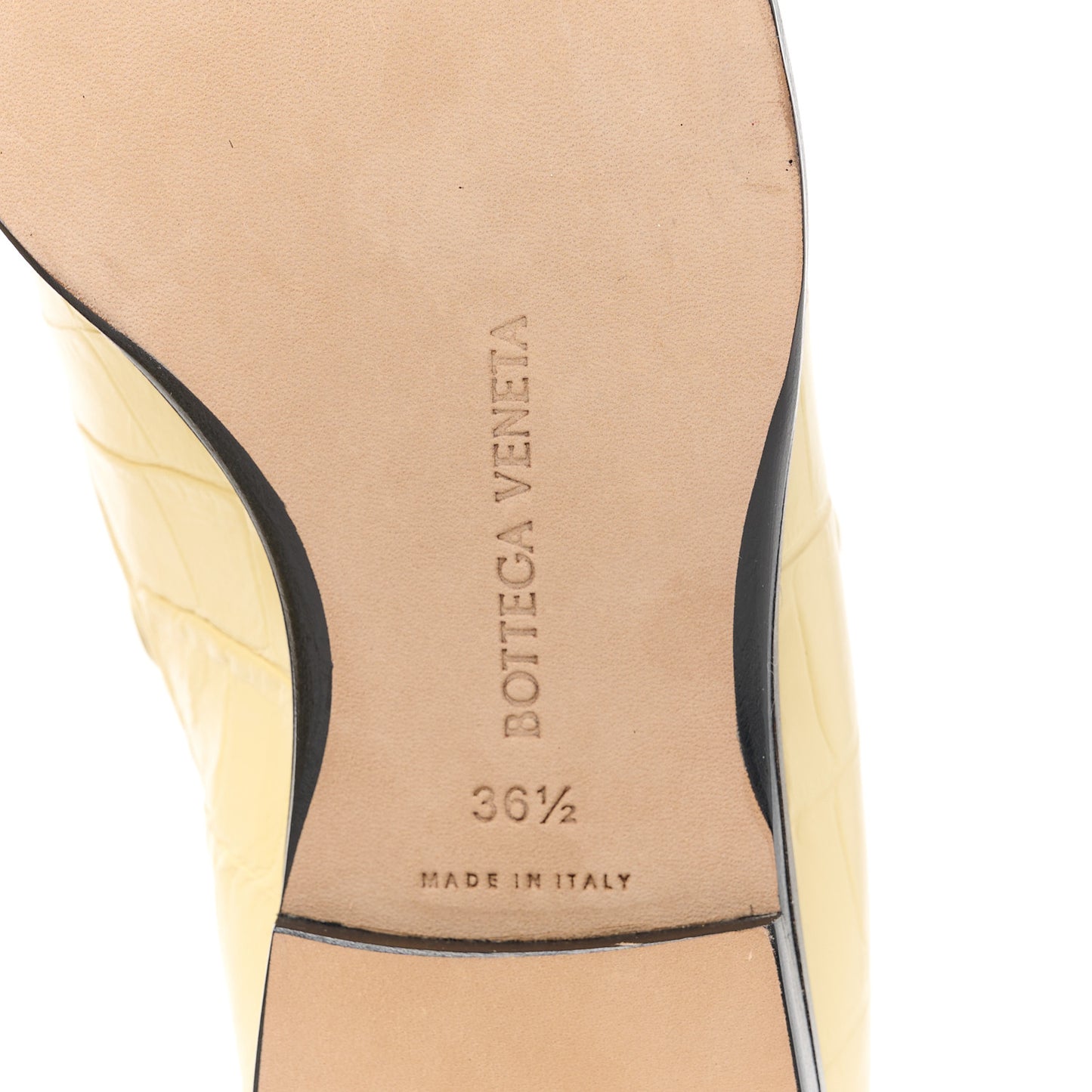 These are authentic BOTTEGA VENETA Calfskin Alligator Embossed Loafers size 36.5 in Butter. These chic flats are crafted of alligator embossed leather with rubber soles.Follow this item for alerts. Bottega Veneta is a registered trademark of Bottega Veneta. FASHIONPHILE is not affiliated with Bottega Veneta.