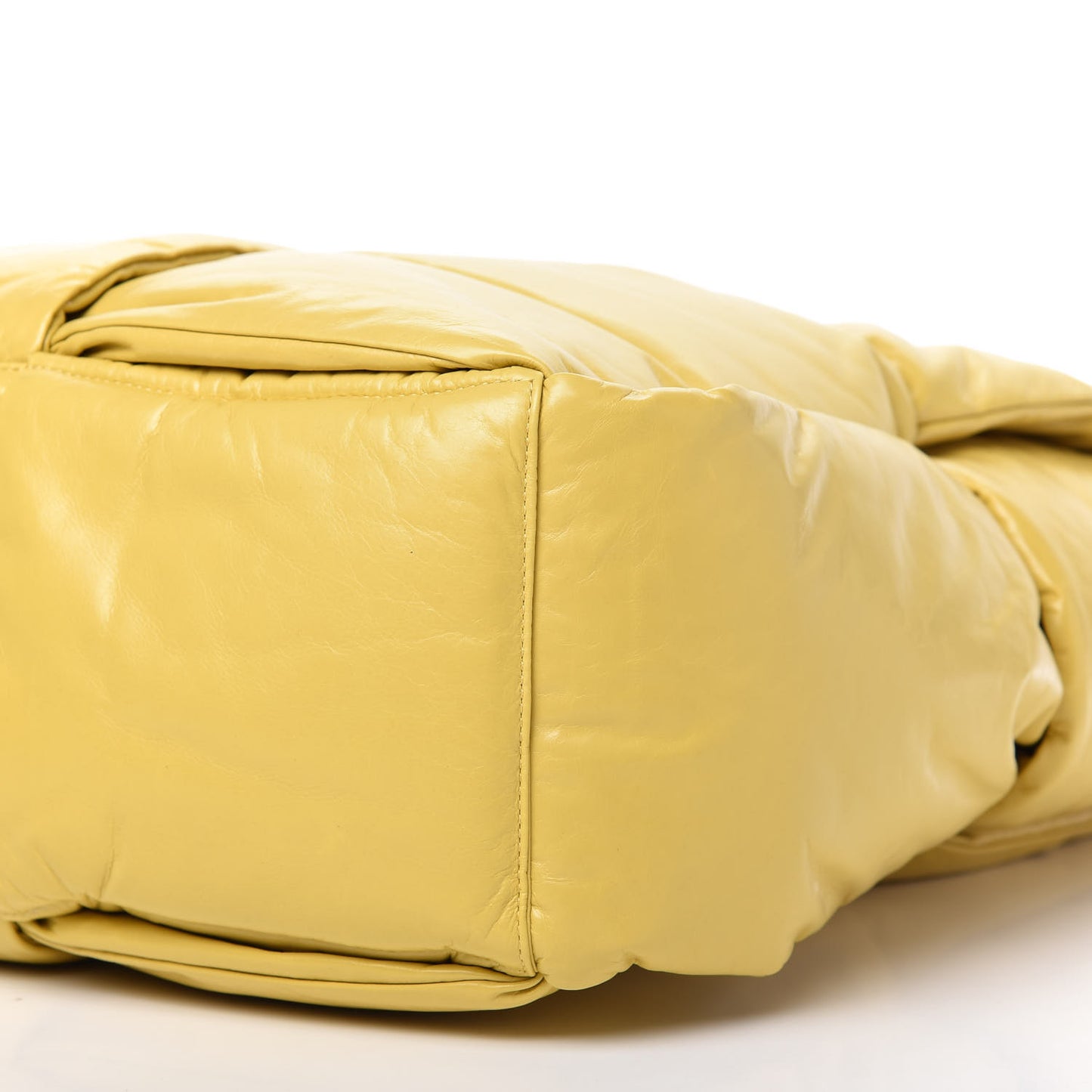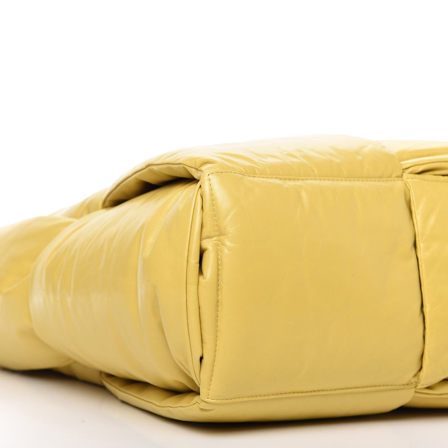 This is an authentic BOTTEGA VENETA Calfskin Maxi Intrecciato Puffy Chain Tote Bag in Straw. This shoulder bag is crafted of supple calfskin leather in yellow. The bag opens to a matching leather interior and a thick gold chain strap.Follow this item for alerts. Bottega Veneta is a registered trademark of Bottega Veneta. FASHIONPHILE is not affiliated with Bottega Veneta.