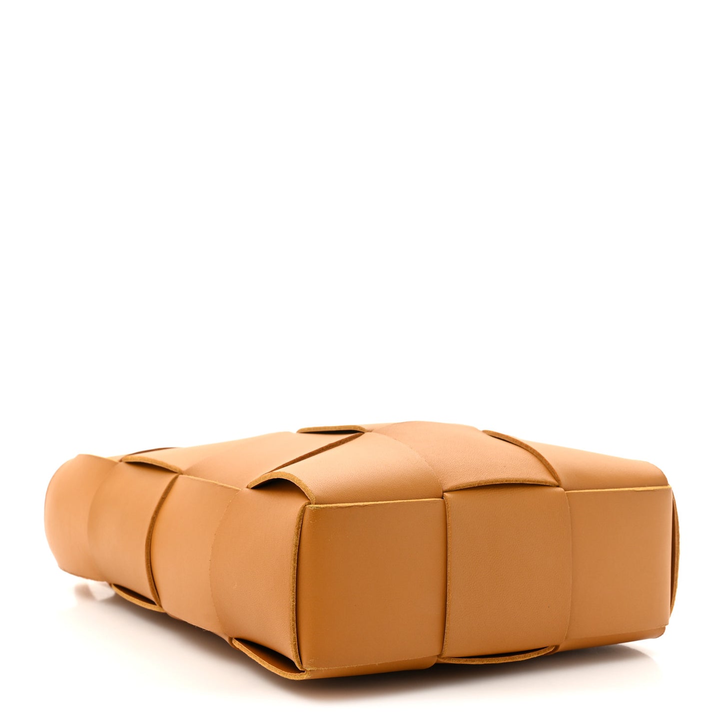 This is an authentic BOTTEGA VENETA Lambskin Maxi Intrecciato Mini North South Cassette Tote in Camel Gold. This stylish messenger bags crafted of tightly woven intrecciato leather in camel. It features a matching adjustable crossbody strap with aged gold hardware. The bag has two small leather strips which tie the open top, and has a matching leather interior with a hanging zipper pocket.Follow this item for alerts. Bottega Veneta is a registered trademark of Bottega Veneta. FASHIONPHILE is not affiliated with Bottega Veneta.