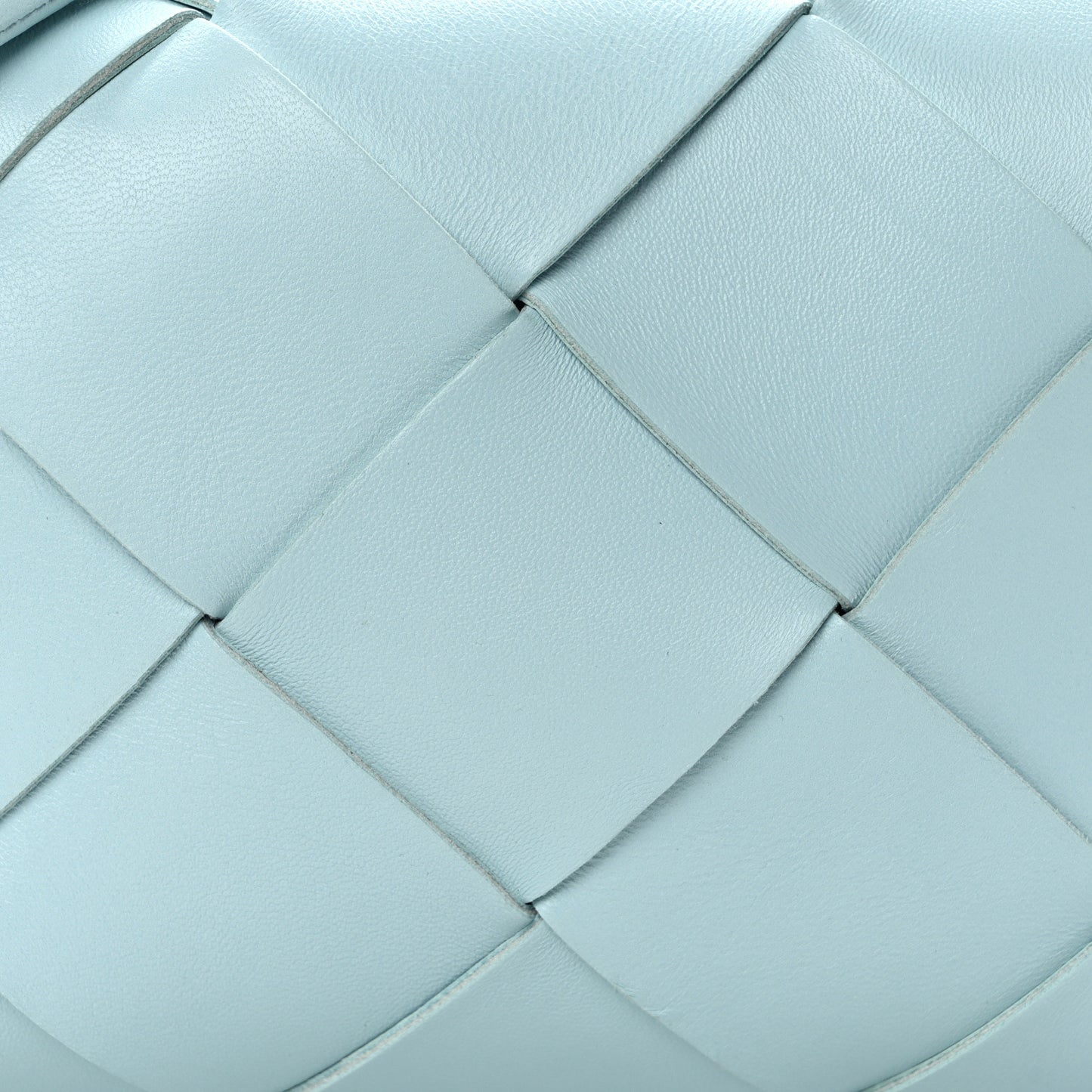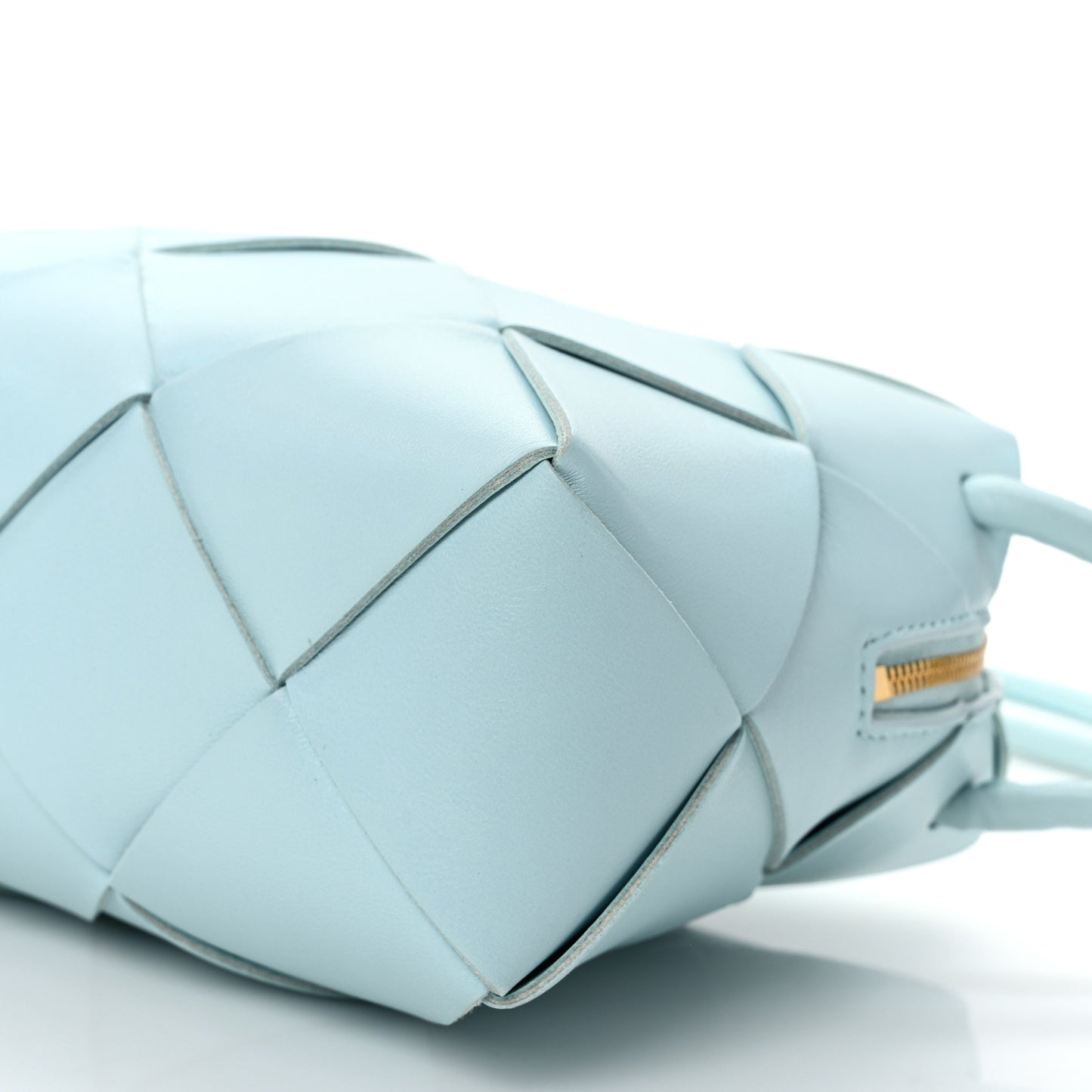 This is an authentic BOTTEGA VENETA Maxi Intreccio Small Cassette Camera Bag in Teal. This stylish mini bag is crafted of woven lambskin leather in teal. The bag features a long shoulder strap with knot details and gold hardware. The top zipper opens to a matching leather interior.Follow this item for alerts. Bottega Veneta is a registered trademark of Bottega Veneta. FASHIONPHILE is not affiliated with Bottega Veneta.