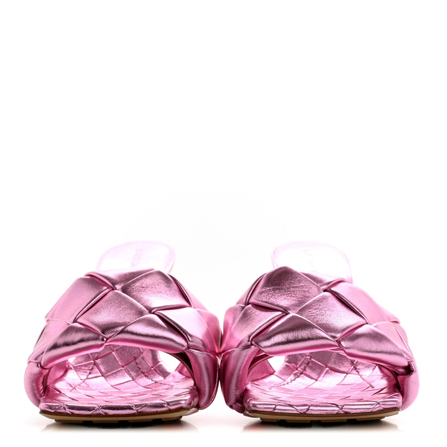 This is an authentic pair of BOTTEGA VENETA Metallic Nappa Maxi Intrecciato Lido 90mm Mule Sandals size 37.5 in Azalea. These stunning sandals are crafted of woven lambskin leather in a metallic pink and feature an elongated square open toe with a 4-inch heel.Follow this item for alerts. Bottega Veneta is a registered trademark of Bottega Veneta. FASHIONPHILE is not affiliated with Bottega Veneta.