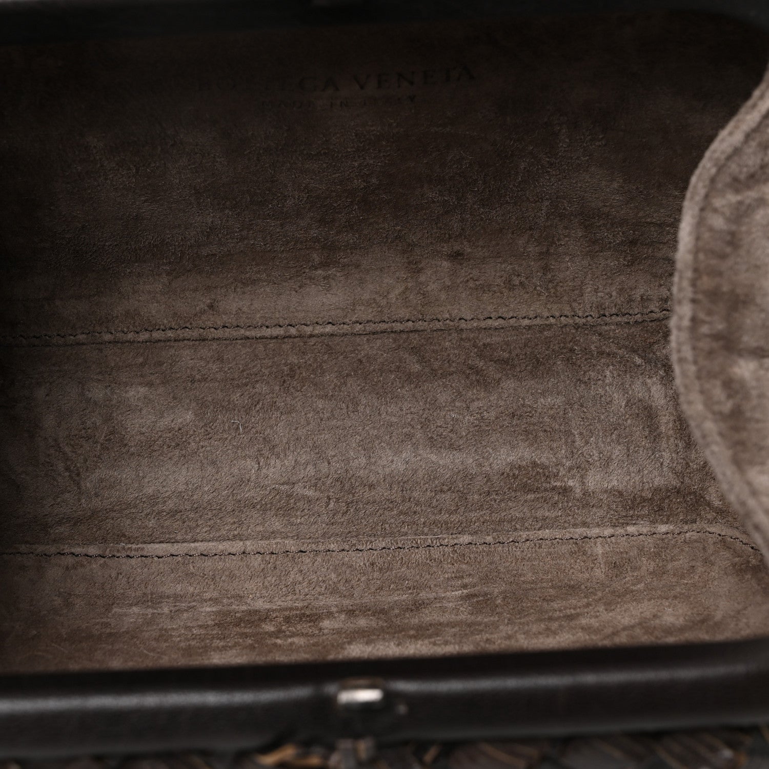 This is an authentic BOTTEGA VENETA Nappa Fringe Intrecciato Knot Clutch in Moro. This stylish clutch is crafted of knots of woven intrecciato fringed leather in dark brown. This clutch features a top kiss lock crafted of matte gunmetal hardware and opens to a taupe suede interior.Follow this item for alerts. Bottega Veneta is a registered trademark of Bottega Veneta. FASHIONPHILE is not affiliated with Bottega Veneta.