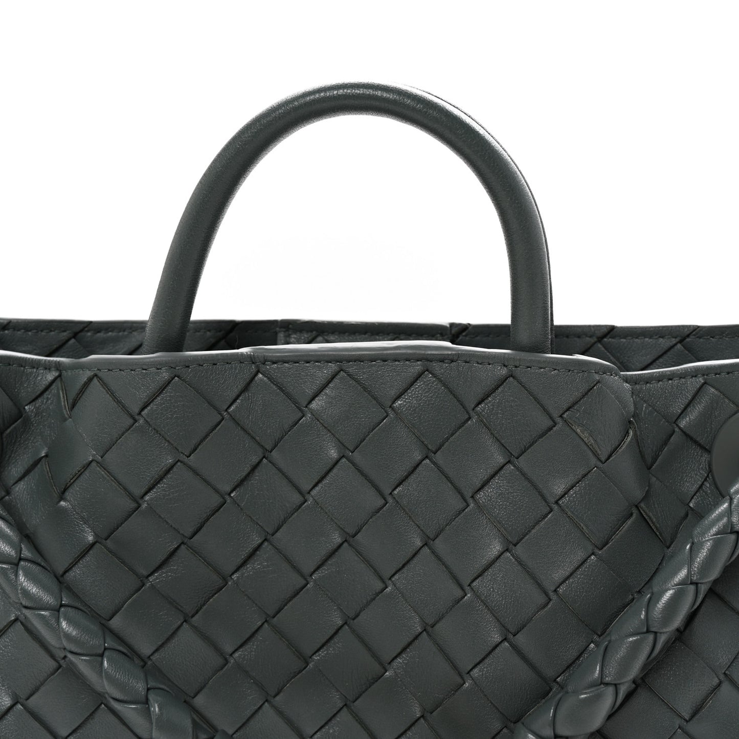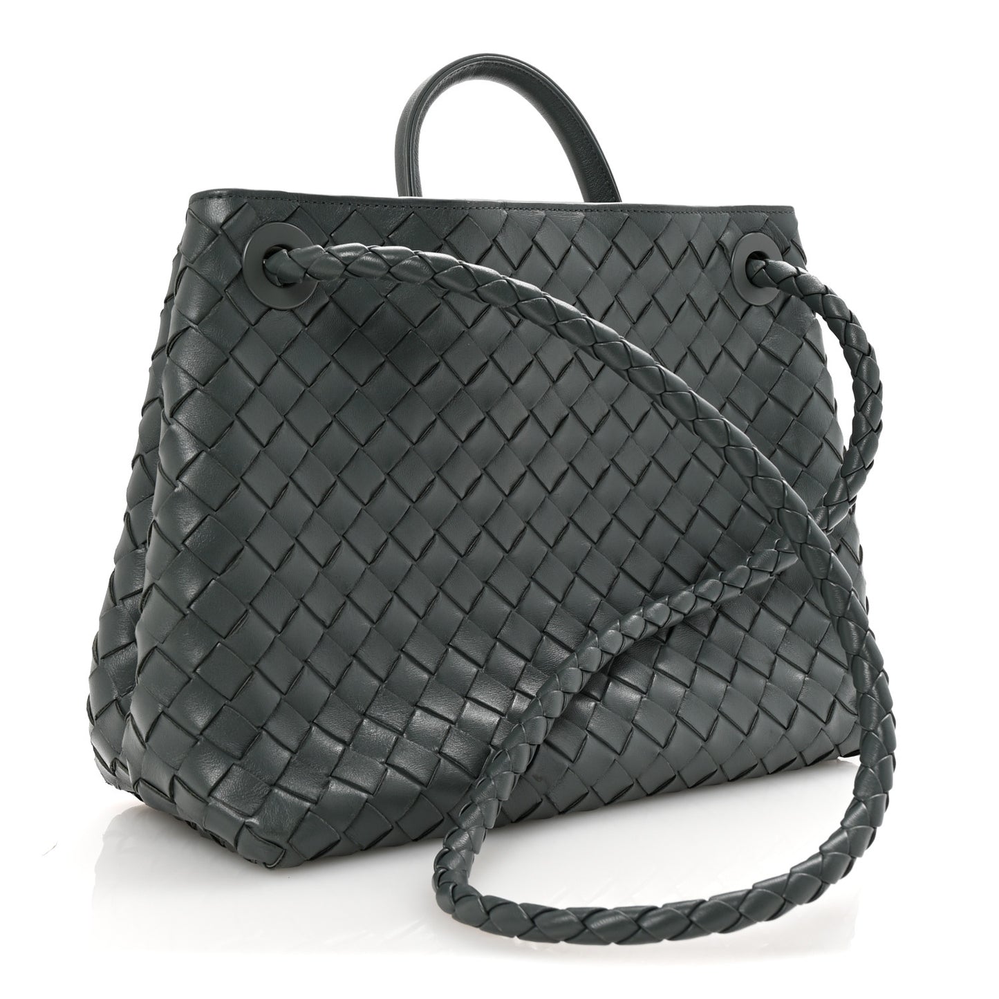 This is an authentic BOTTEGA VENETA Nappa Intrecciato Medium Andiamo Shoulder Bag in Slate. This stylish bag is crafted of nappa leather with Bottega Veneta's signature woven detailing in grey green. The bag features a rolled leather top handle, and a longer woven leather strap that can be worn as a crossbody or shoulder bag with an aged gold knot-shaped clasp to remove the strap. The top opens to a leather interior with a pouch connected to the removable strap with a zipper compartment and patch pockets.Follow this item for alerts. Bottega Veneta is a registered trademark of Bottega Veneta. FASHIONPHILE is not affiliated with Bottega Veneta.