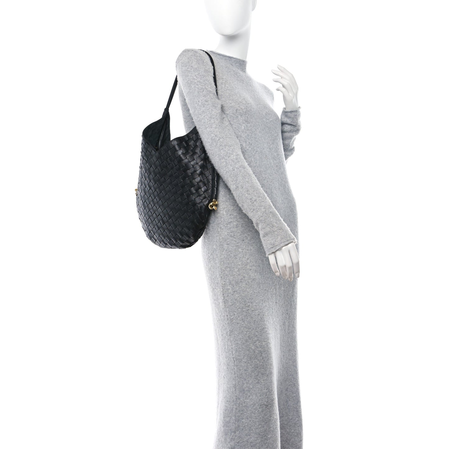 This is an authentic BOTTEGA VENETA Nappa Intrecciato Medium Solstice Hobo in Black. This shoulder bag is crafted of tightly woven lambskin leather in black. The bag features a rolled leather shoulder strap with gold-toned knot details at either end and a top tie strap. This opens to a black suede interior with a zippered pouch.Follow this item for alerts. Bottega Veneta is a registered trademark of Bottega Veneta. FASHIONPHILE is not affiliated with Bottega Veneta.