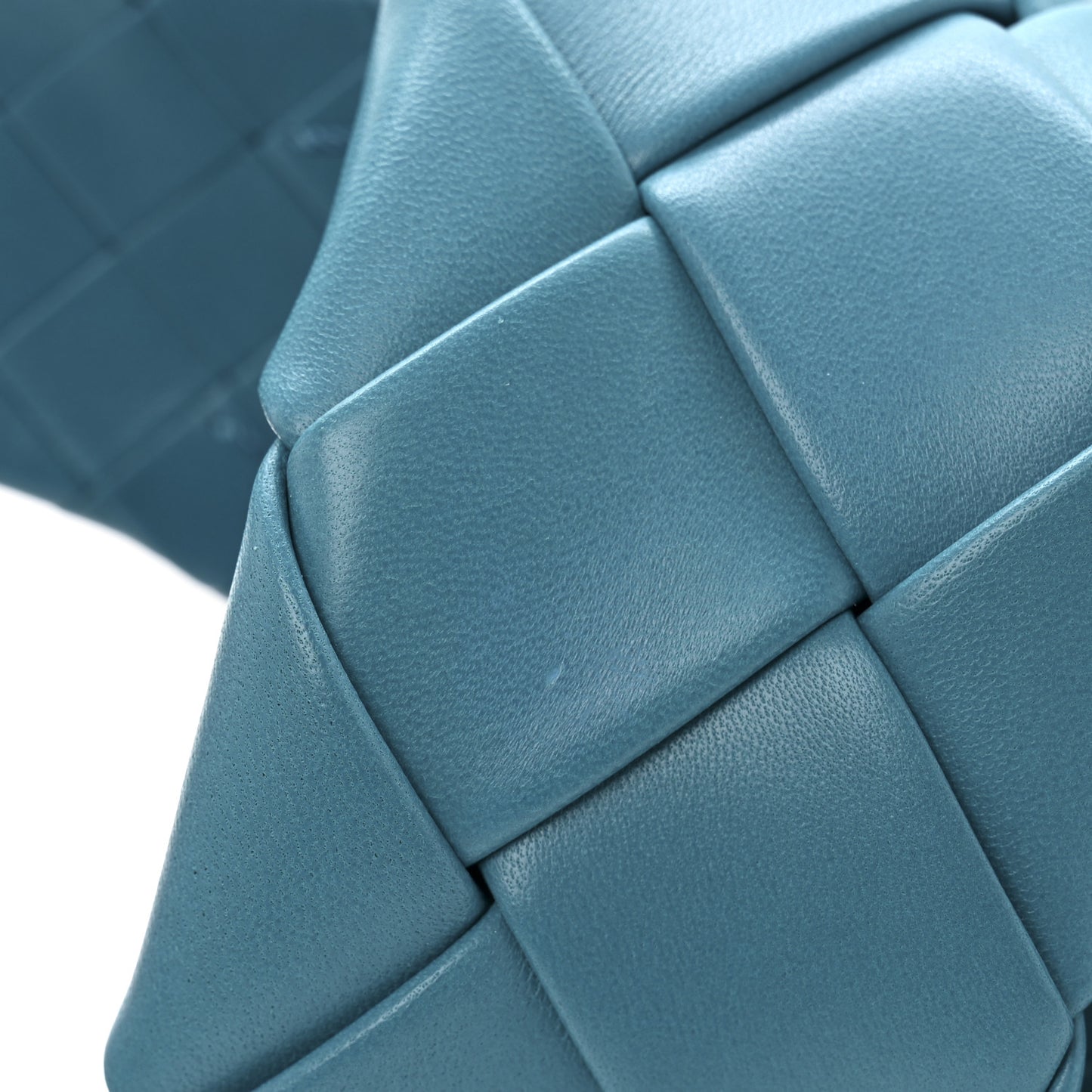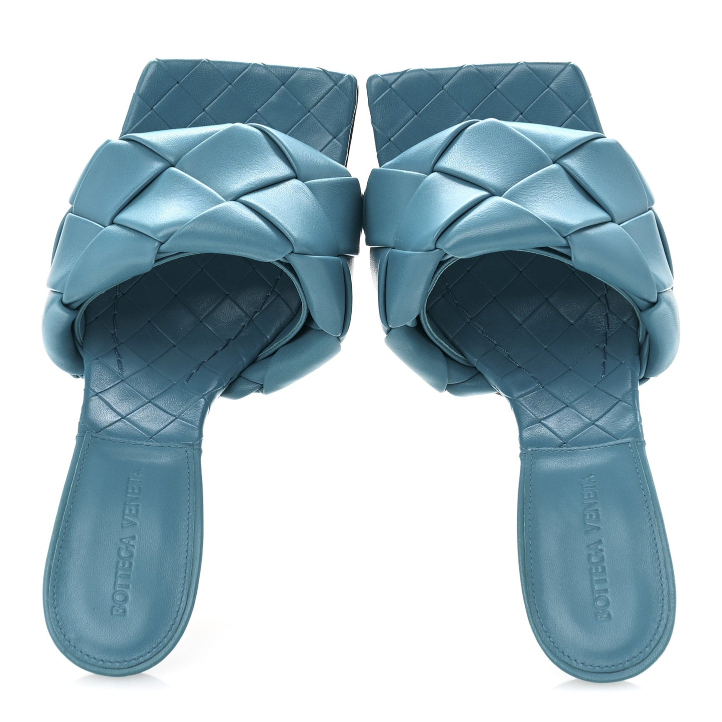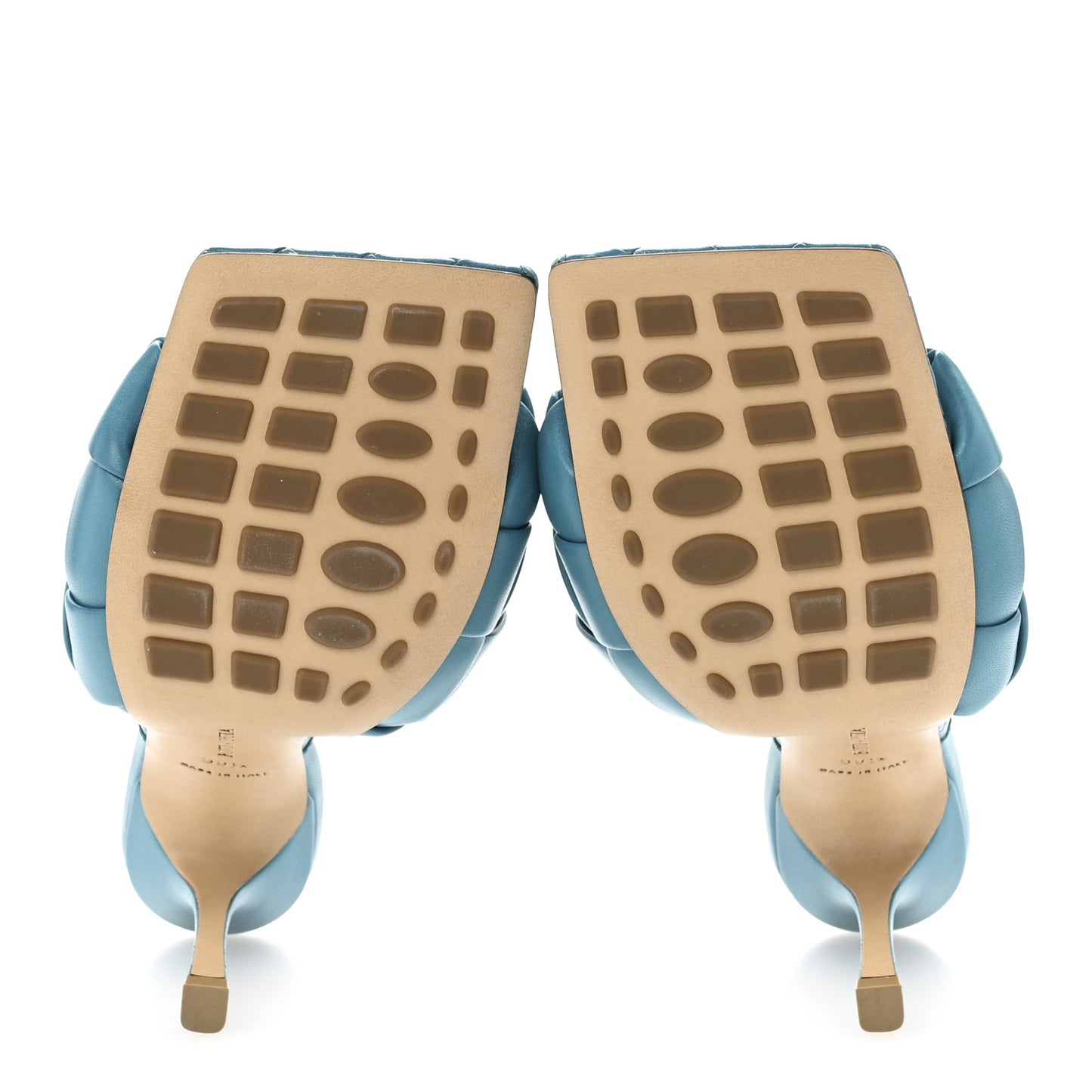These is an authentic pair of BOTTEGA VENETA Nappa Maxi Intrecciato Lido 90mm Mule Sandals size 39.5 in Blaster. These sandals are crafted of woven lambskin leather in blue. They feature squared soles and 4-inch heels.Follow this item for alerts. Bottega Veneta is a registered trademark of Bottega Veneta. FASHIONPHILE is not affiliated with Bottega Veneta.