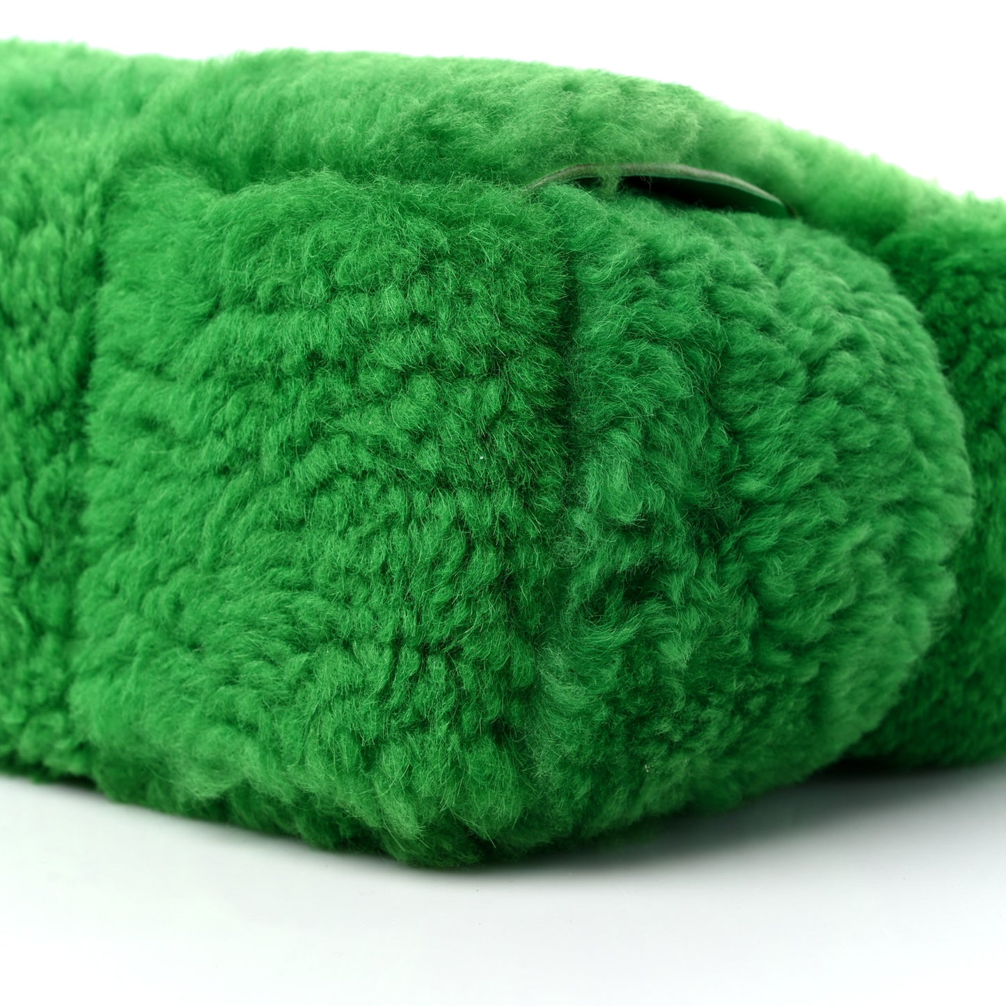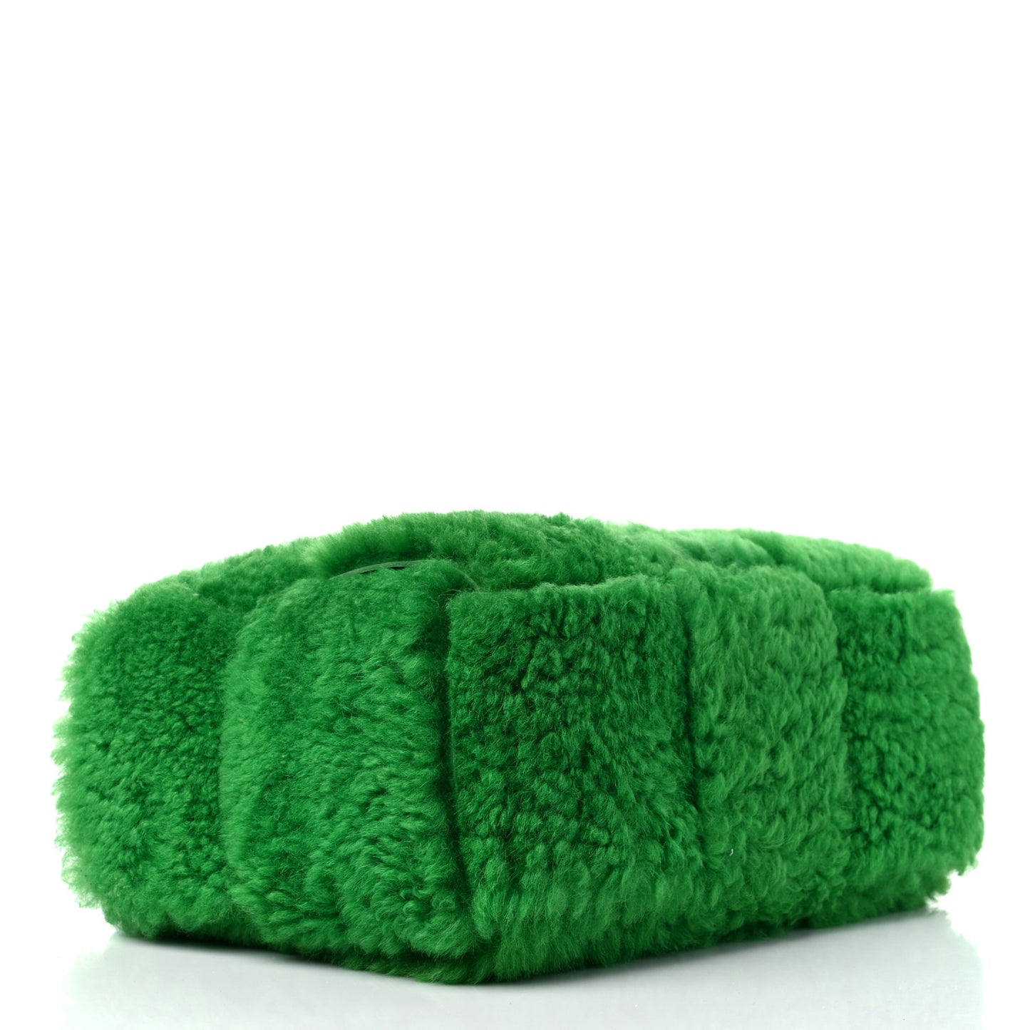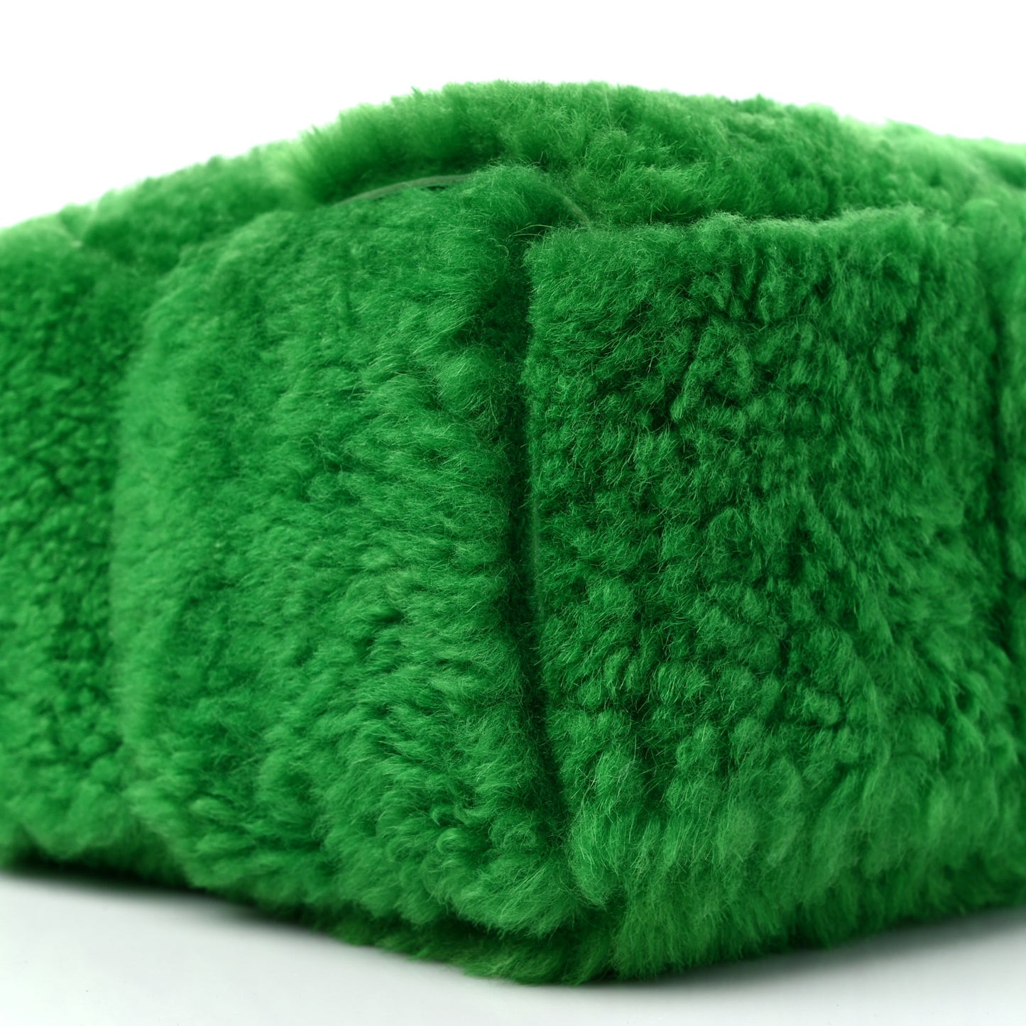 This is an authentic BOTTEGA VENETA Shearling Small Intrecciato Arco Tote in Parakeet. This versatile and spacious tote is superbly crafted of shearling with green leather handles. The bag has an open top and a matching green leather interior with a removable pouch.