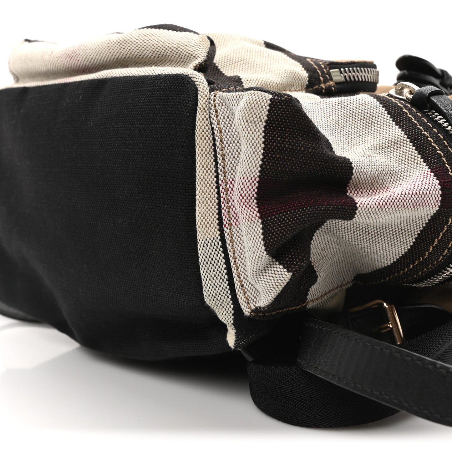 This is an authentic BURBERRY Canvas Mega Check Medium Rucksack Backpack in Black. This chic backpack is crafted of Burberry check canvas in the signature beige, black, white, and red. The bag features adjustable nylon and leather shoulder straps, a black padded back, a front and two side zipper pockets, and black leather trim including a rolled leather handle with polished gold hardware.Follow this item for alerts. Burberry is a registered trademark of Burberry. FASHIONPHILE is not affiliated with Burberry.
